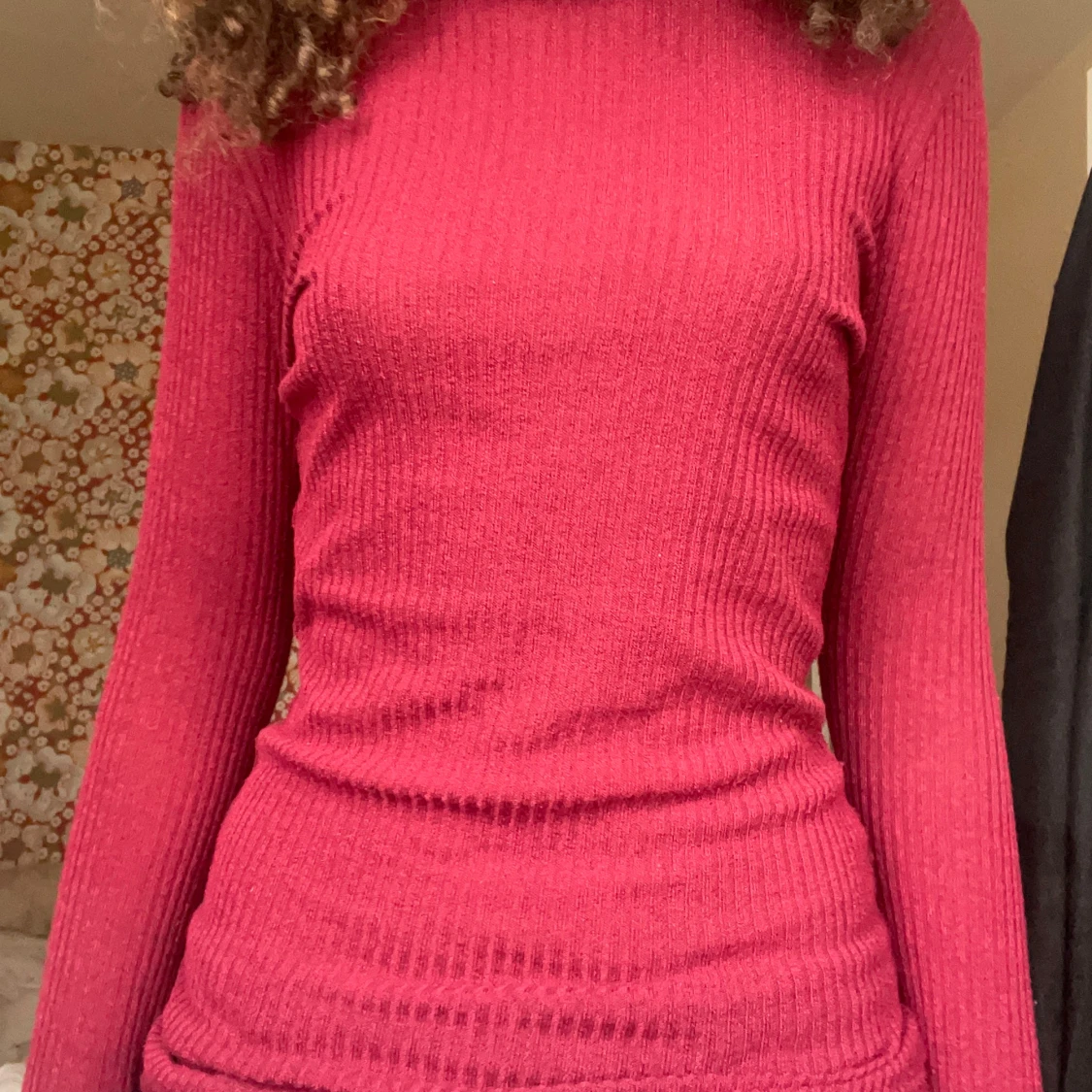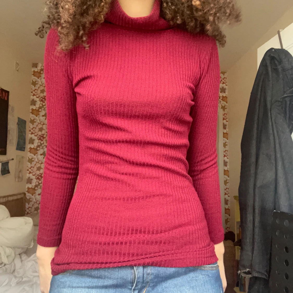 Snygg vinröd polotröja med ribbad struktur. Perfekt för kyligare dagar med sin långa ärmar och sköna passform.