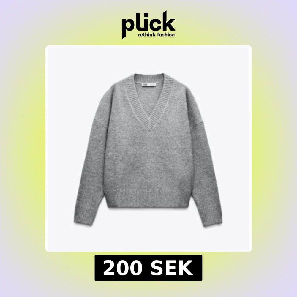 Säljer en mysig grå stickad tröja från Zara med v-ringning. Tröjan har långa ärmar och en avslappnad passform, perfekt för kyligare dagar. Den är tillverkad i ett mjukt material som känns skönt mot huden.
