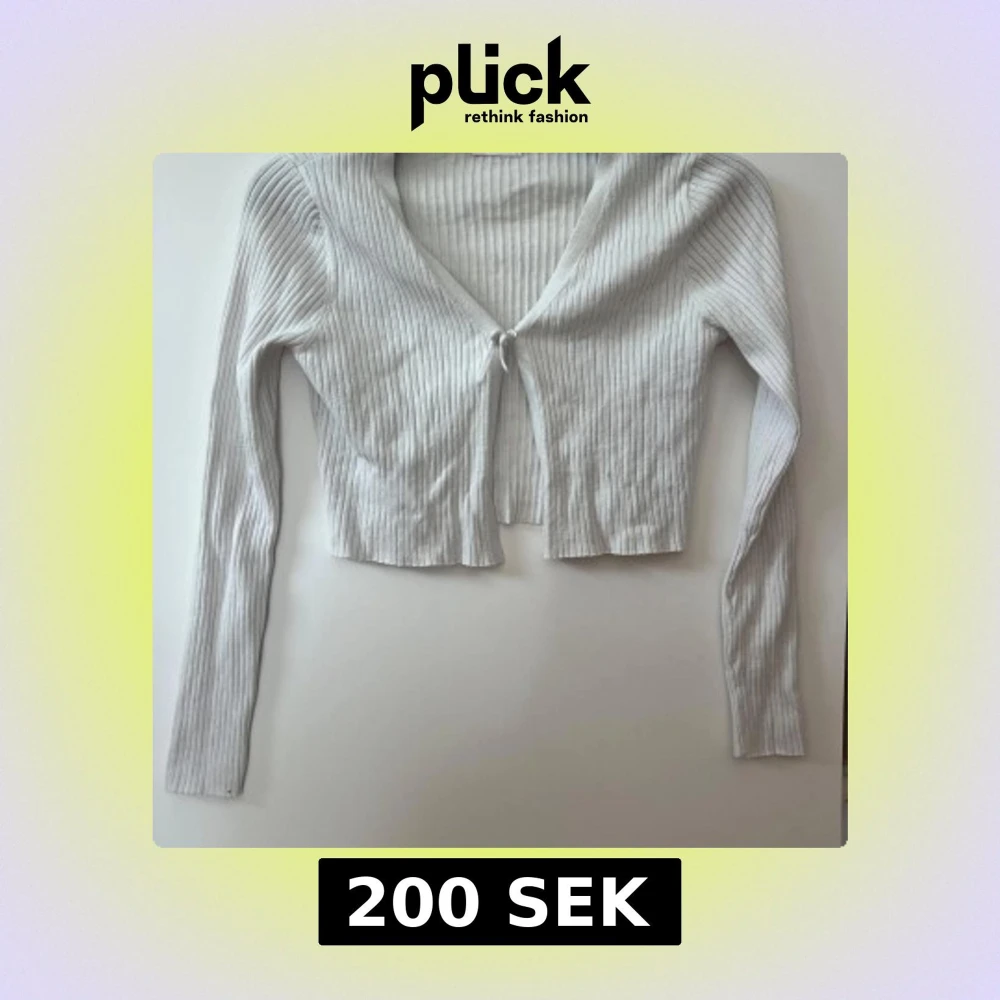Säljer en vit ribbad kofta från Primark köpte Paris. Tröjan är croppad, har långa ärmar och knytning framtill. Perfekt att slänga över en topp för en enkel och stilren look.