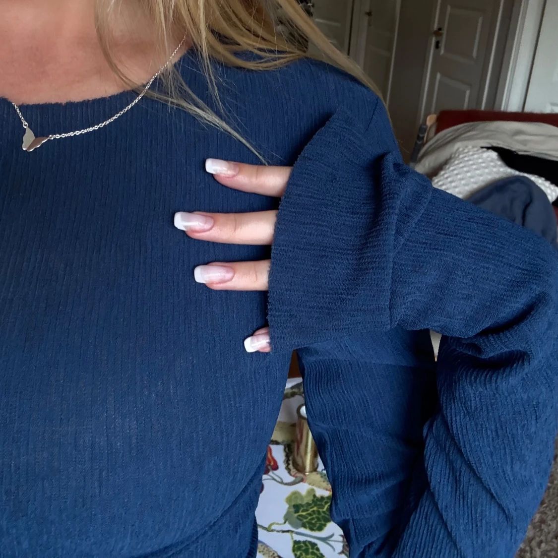 Säljer en mörkblå långärmad topp med ribbat material. Säljer då den blivit för liten för mig.🥲🩷