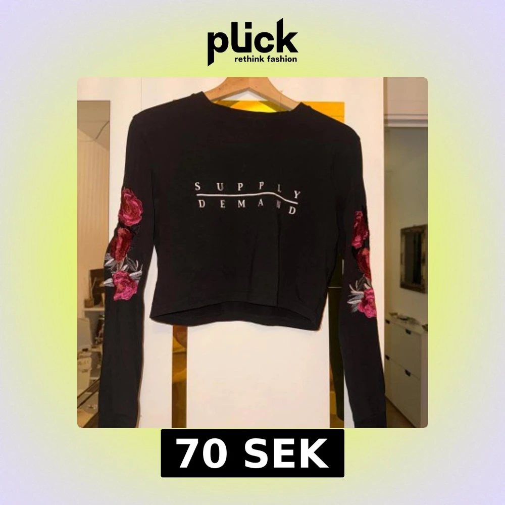 Svart croppad långärmad tröja från Supply & Demand med vit text fram och bak. Snygga broderade röda och rosa blommor på ärmarna ger en unik vibe. Perfekt för dig som gillar streetstyle och detaljer. Mjuk bomullskänsla och normal passform.