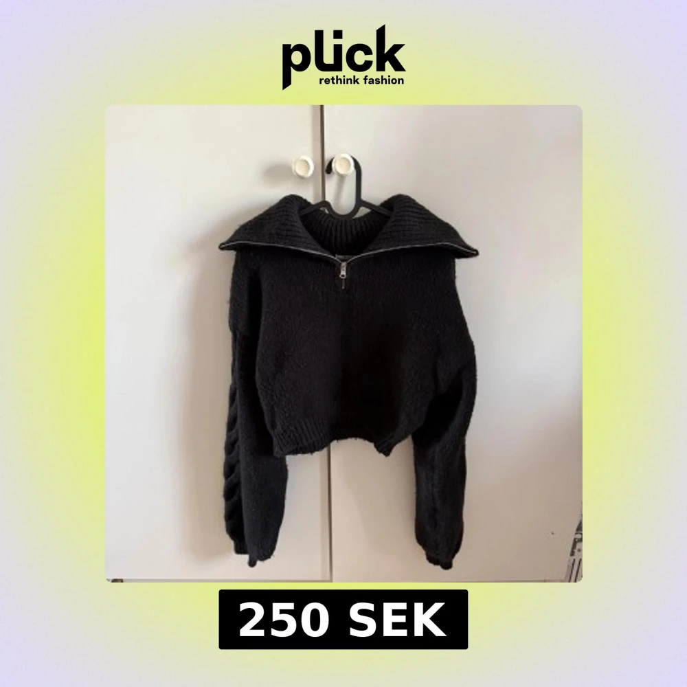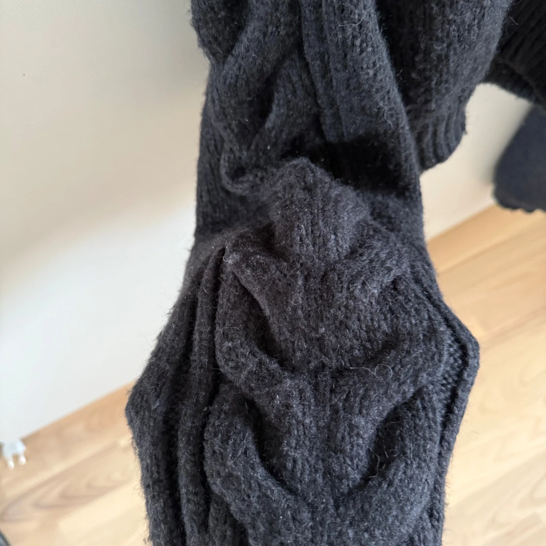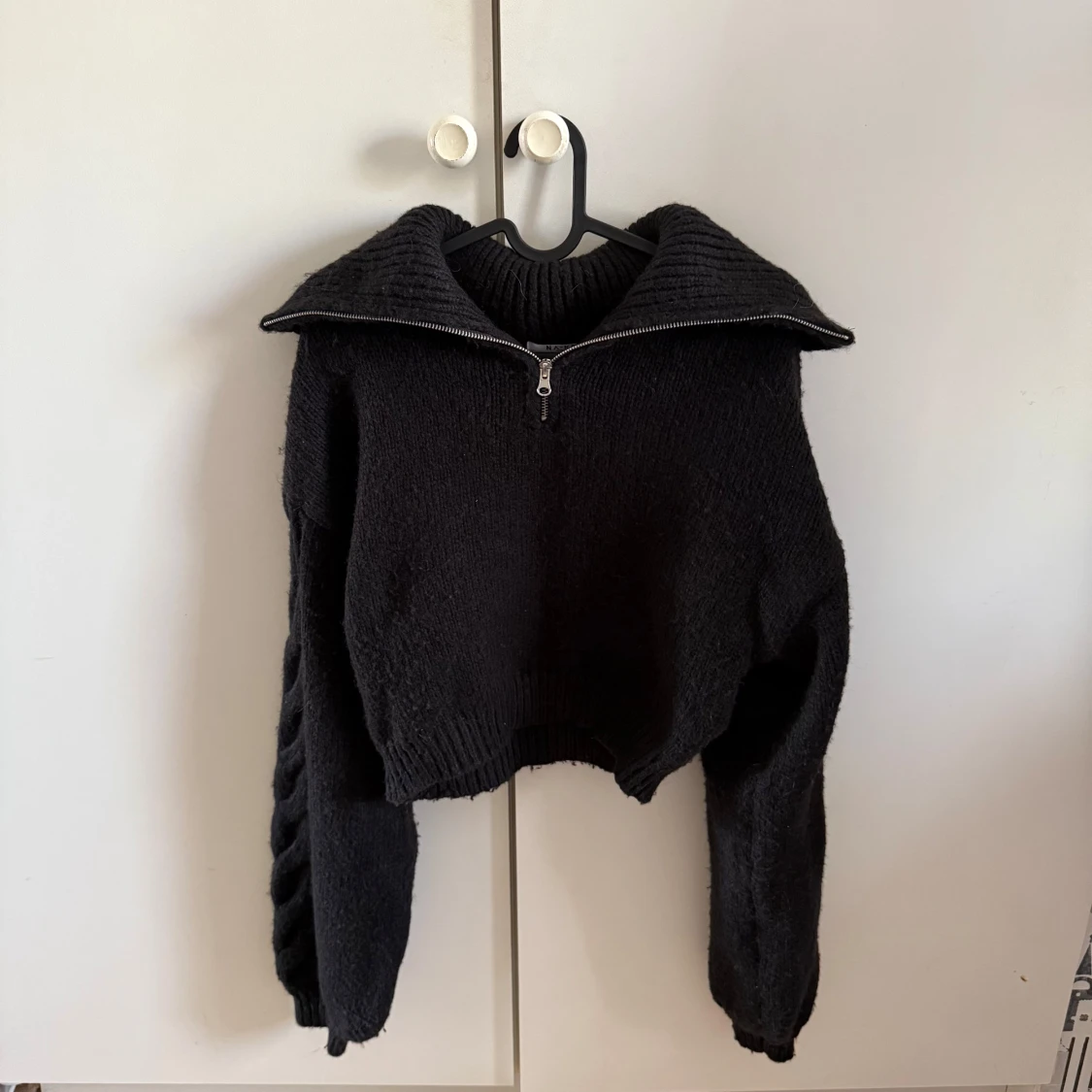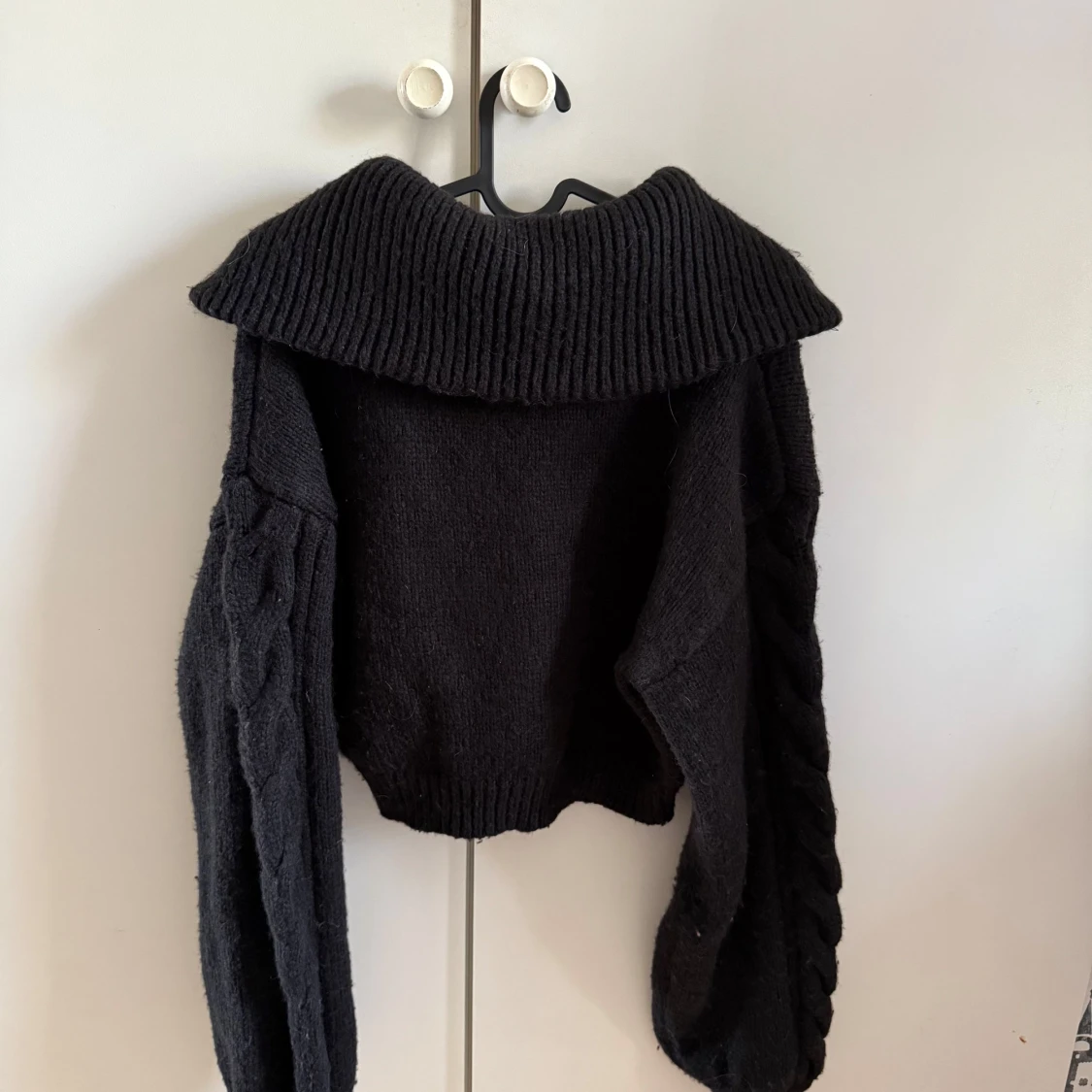 Svart stickad croppad tröja med bred krage och dragkedja framtill. Ärmarna har ett snyggt flätmönster som ger extra detalj.