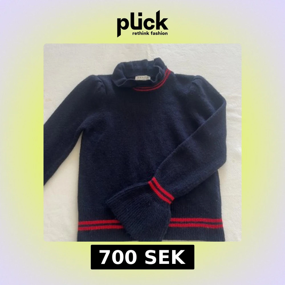 Mörkblå stickad tröja från Sandro Paris med röd rand vid krage, ärmslut och nederkant. Tröjan har hög, volangig krage och långa ärmar. Perfekt för dig som gillar klassiska detaljer med en twist. Den är i sandro storleken 1 och är supersöt nu till sommaren med en vit kjol!! Aldrig använd