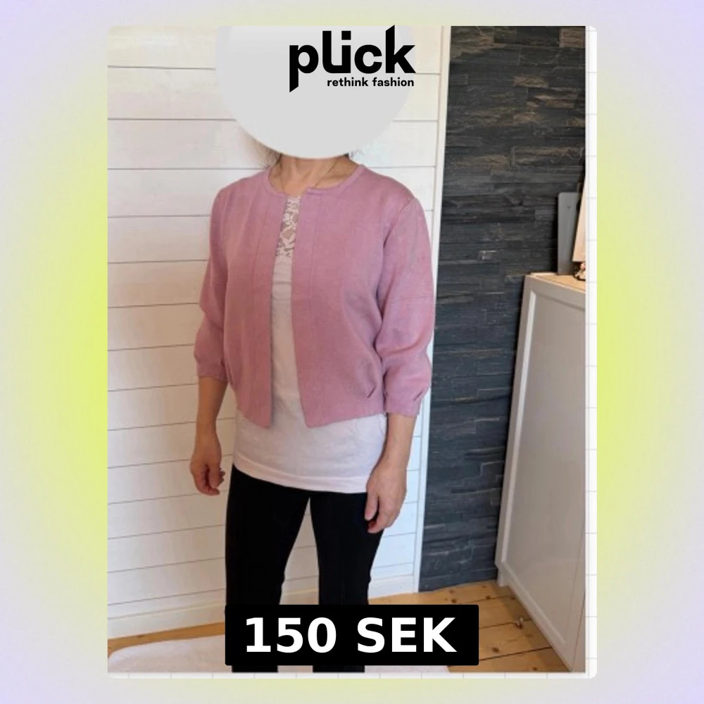Helt ny: Söt ljusrosa kofta med trekvartsärmar och rund halsringning. Koftan är öppen framtill utan knappar och har en rak, enkel design. Perfekt att slänga över en topp för en chill och stilren look.