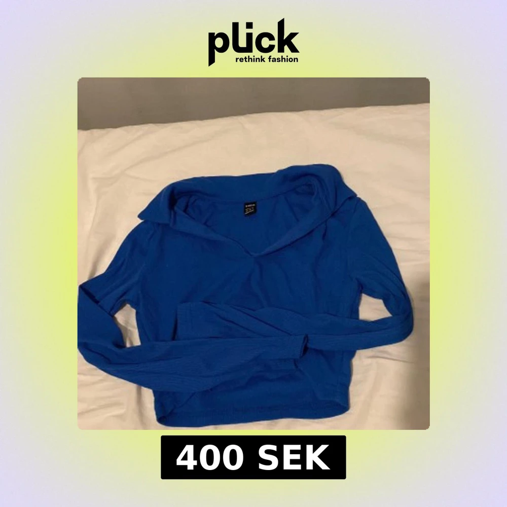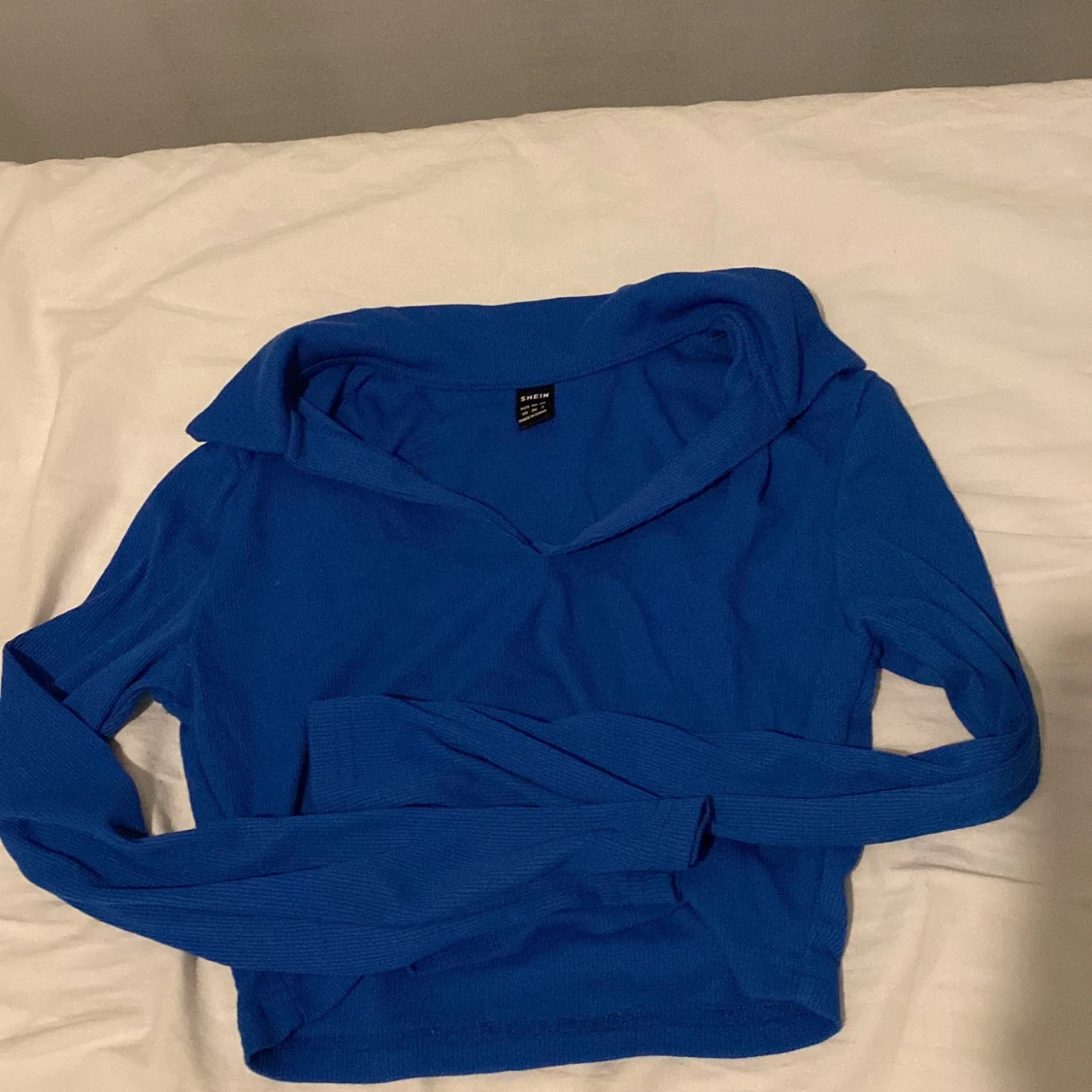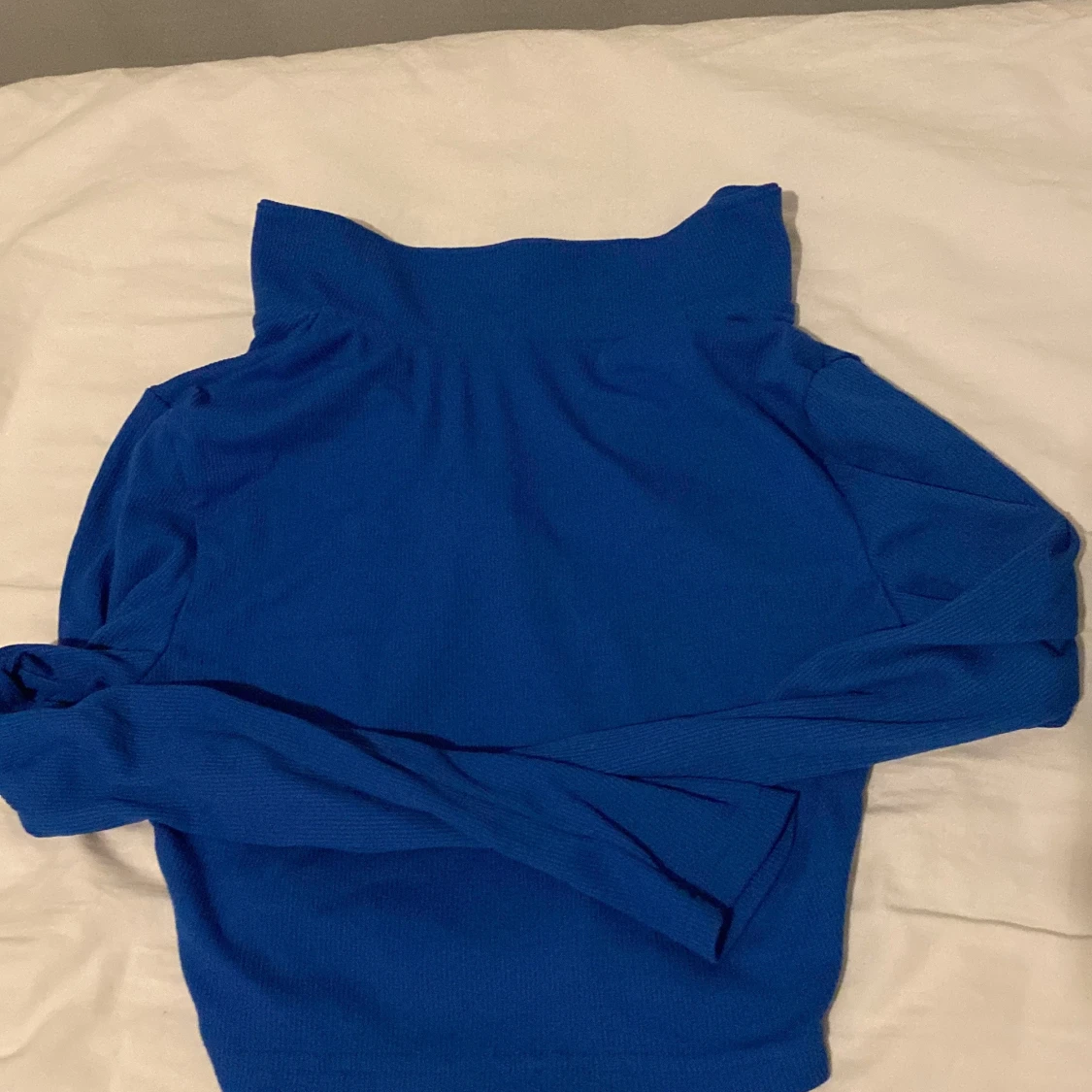 Säljer en snygg blå ribbad tröja med långa ärmar och en unik krage. Perfekt för att hålla sig varm och stilren under kyligare dagar. Passar bra till både jeans och kjol.