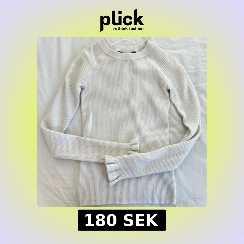 Säljer en stilren vit ribbad tröja med långa ärmar och volangdetaljer vid ärmsluten.