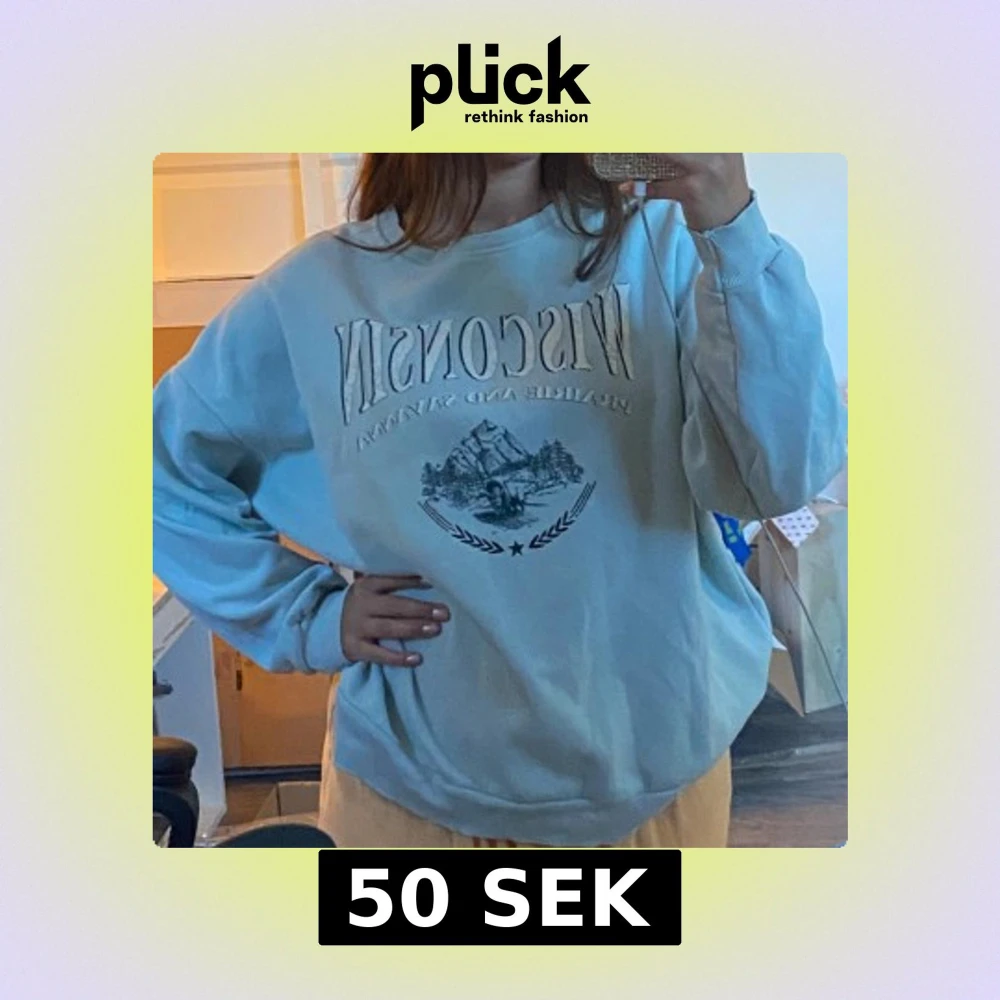 Säljer en ljusblå oversized sweatshirt med tryck 'Wisconsin' och naturmotiv framtill. Tröjan har rund halsringning och långa ärmar med ribbade muddar.