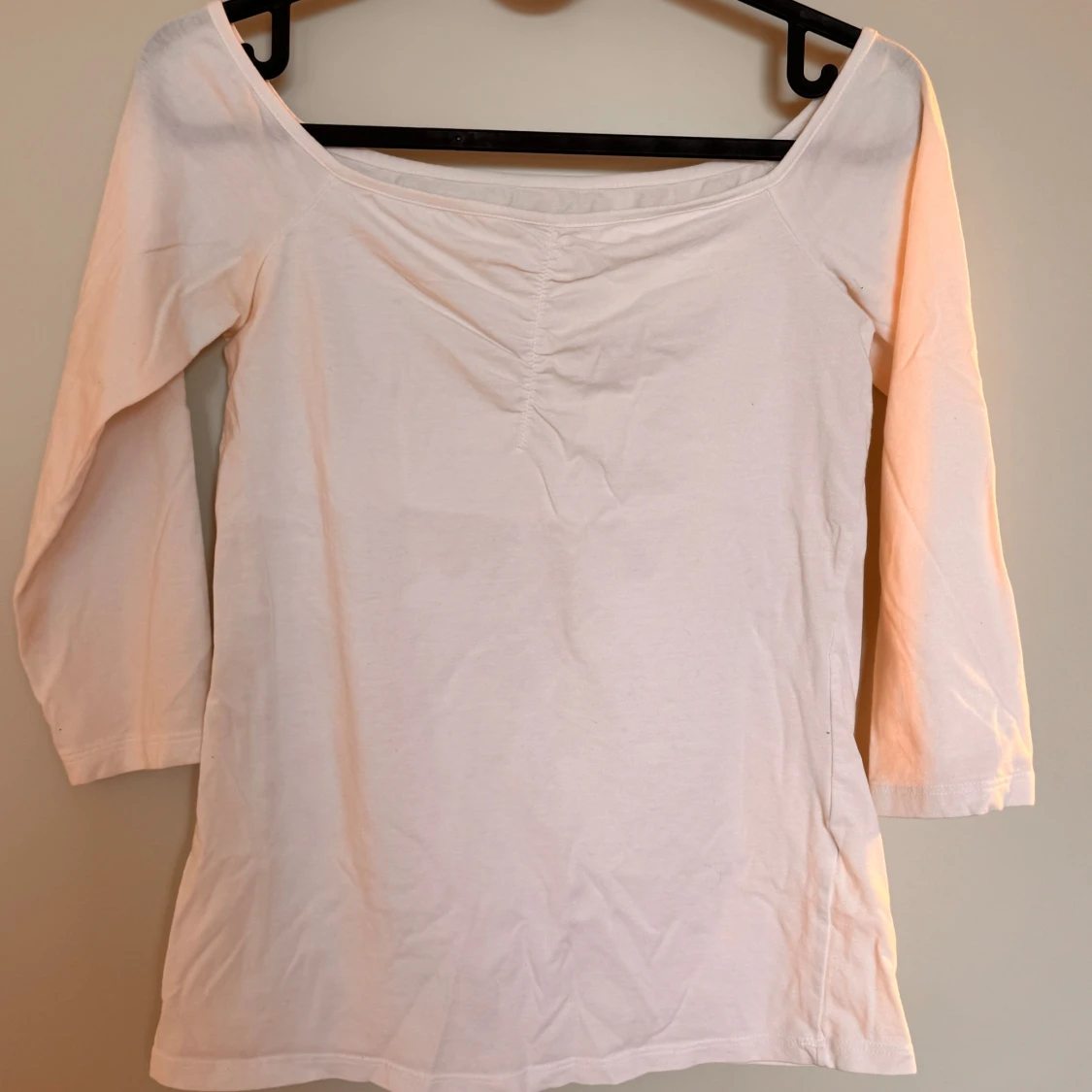 Söt och enkel vit topp med trekvartsärmar och lätt rynkning vid bysten som ger en fin passform. Stretchigt och mjukt material som är bekvämt att bära. Passar perfekt till både vardag och lite mer uppklädda tillfällen. Använd endast ett fåtal gånger!