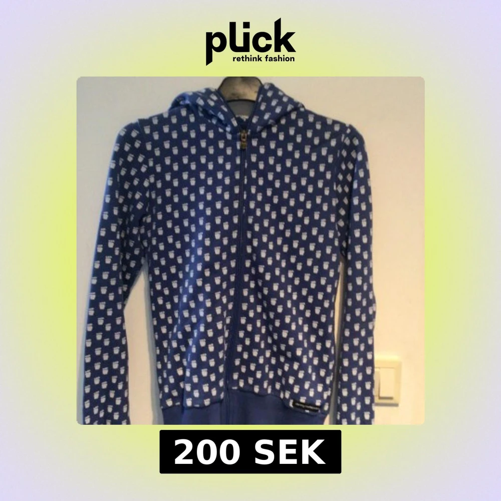 Blå hoodie med dragkedja och huva från Jenny Hellström. Tröjan har ett vitt mönster med små krukor över hela och ribbade muddar vid ärmslut och nederkant. Perfekt för en avslappnad stil.