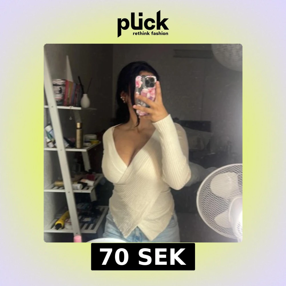 Snygg ribbad omlottopp i ljus beige med djup v-ringning och långa ärmar. Toppen har en figurnära passform och omlott-design som ger en modern och trendig look. Perfekt att styla med jeans eller kjol för en chic vibe.