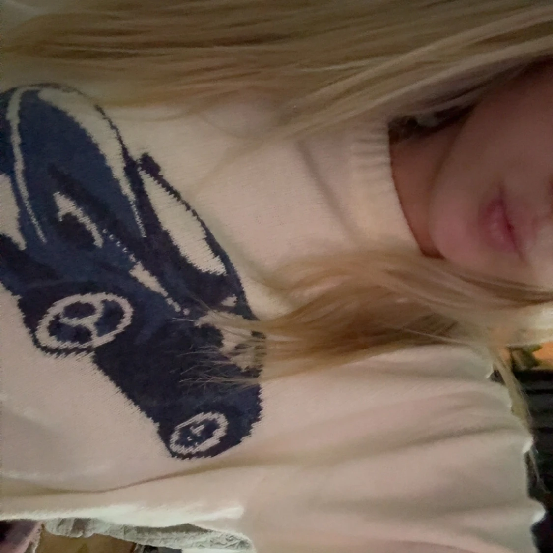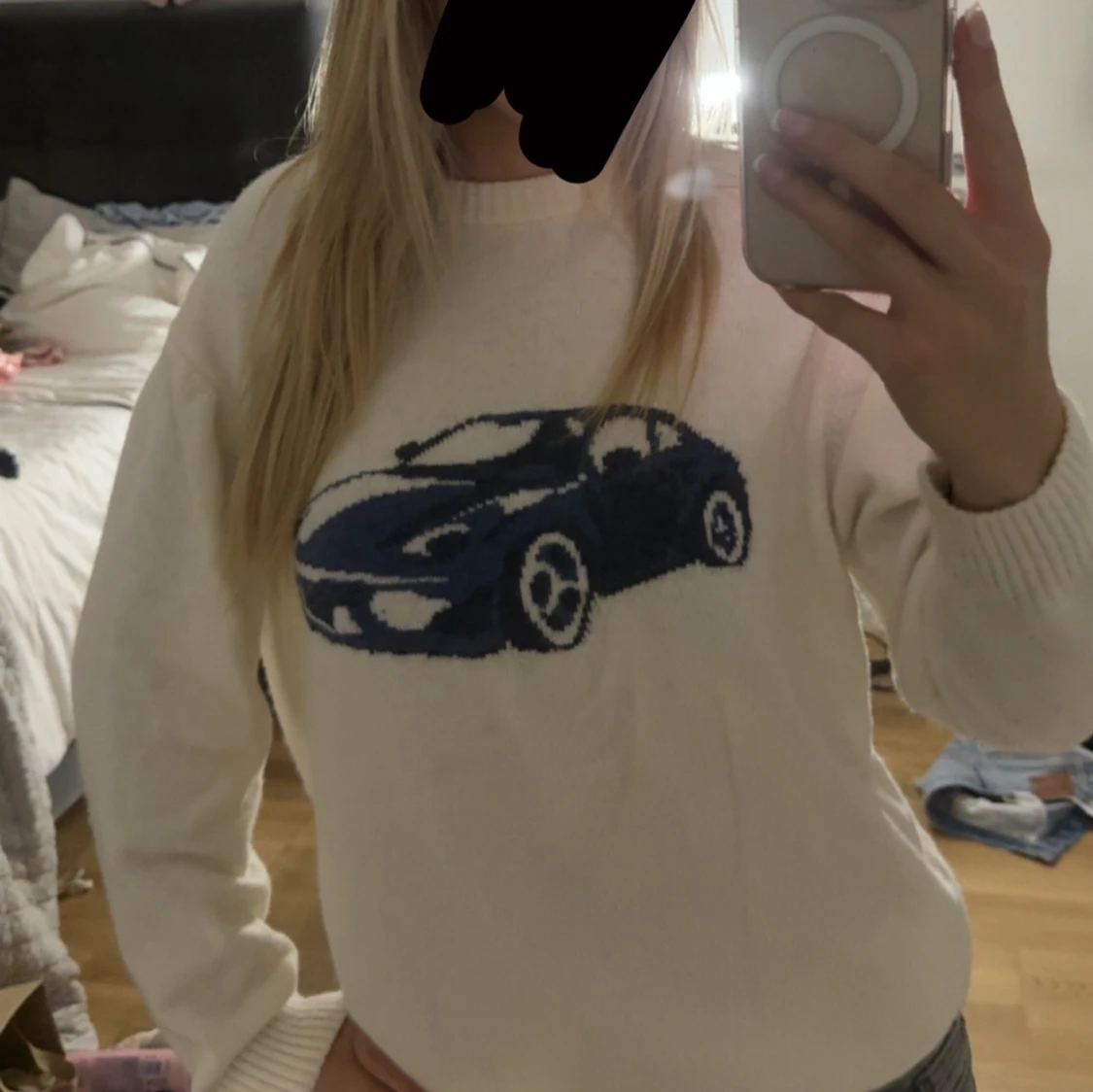 Säljer en vit stickad tröja med ett stort blått bilmotiv på bröstet. Tröjan har rund halsringning och långa ärmar. Från subdued köpt för 799 ish
