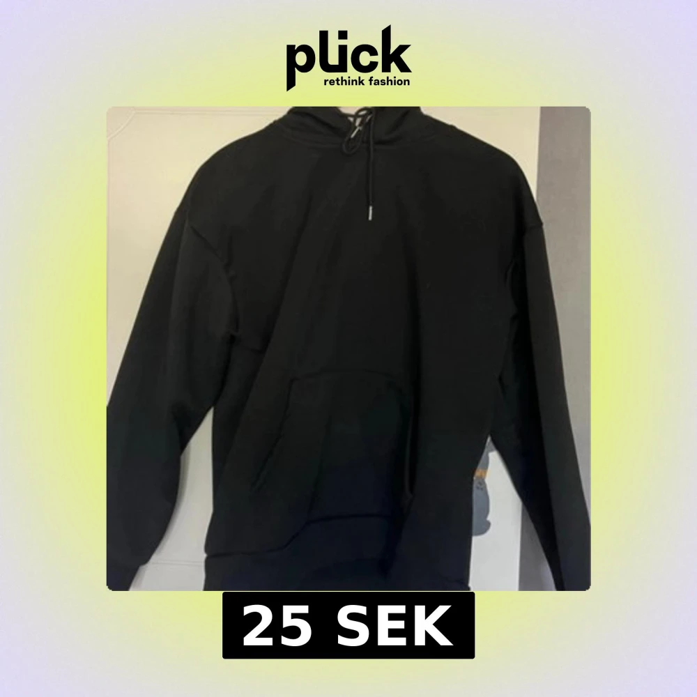 En klassisk svart hoodie med huva och snörning, samt en stor magficka framtill. Tröjan har lång ärm och en relaxed passform, perfekt för chill dagar eller när du vill ha en enkel och stilren look.