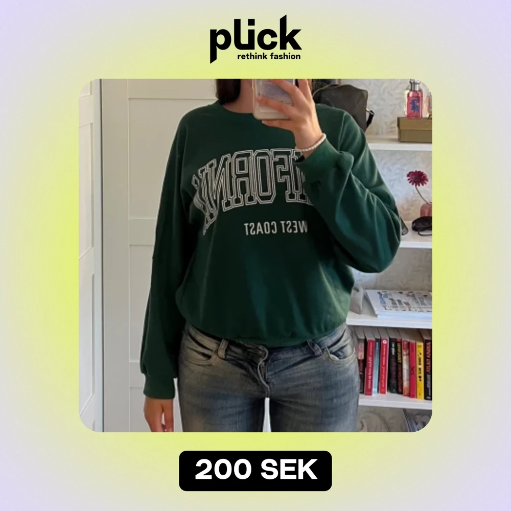 Grön långärmad tröja med tryck. Tryck: ”CALIFORNIA west coast” Storlek 36