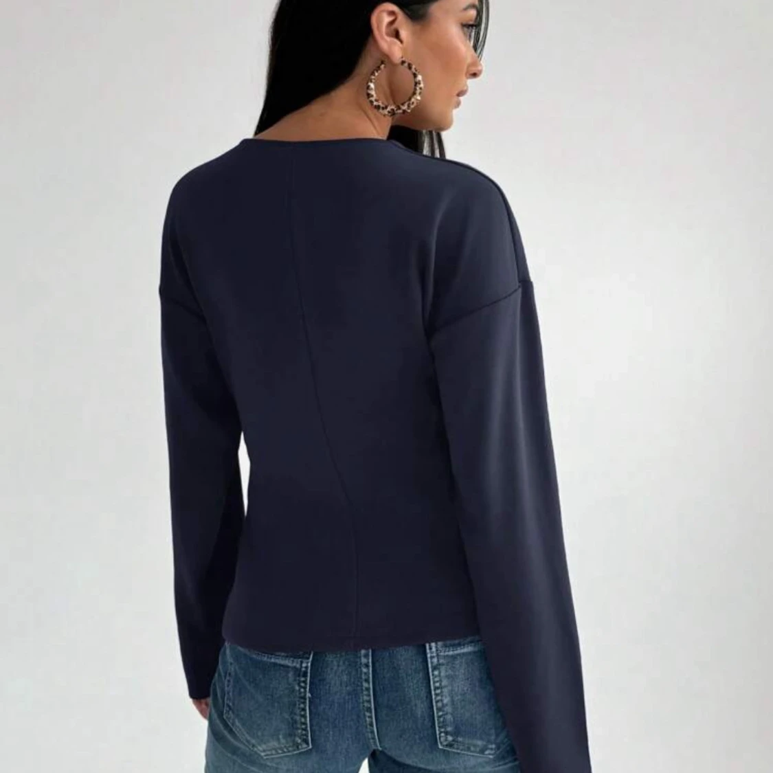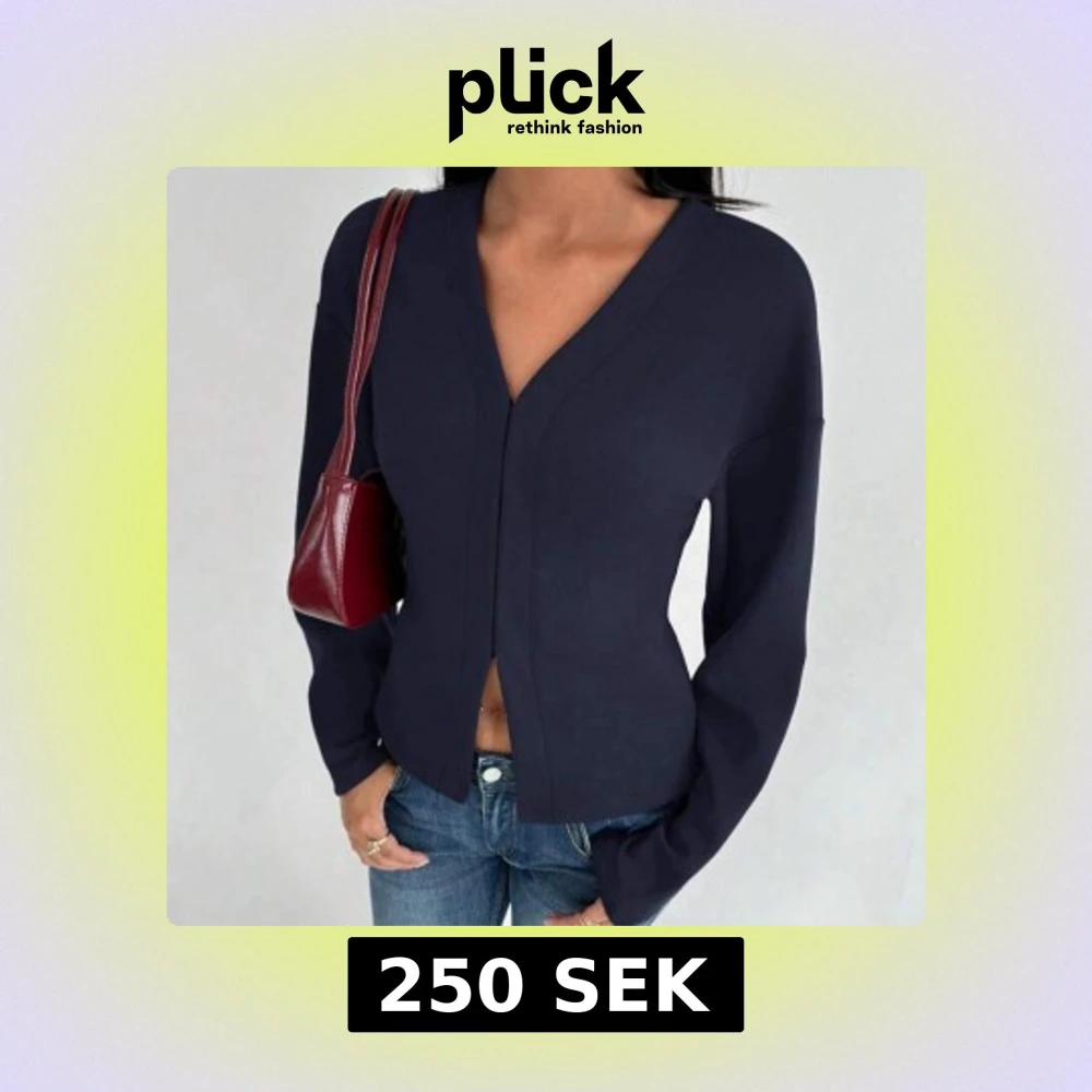 Pris kan diskuteras❤️Snygg mörkblå kofta med v-ringning och lång ärm. Modellen är figurnära med en stilren design utan synliga knappar eller dragkedja. Perfekt att matcha med jeans för en clean look.