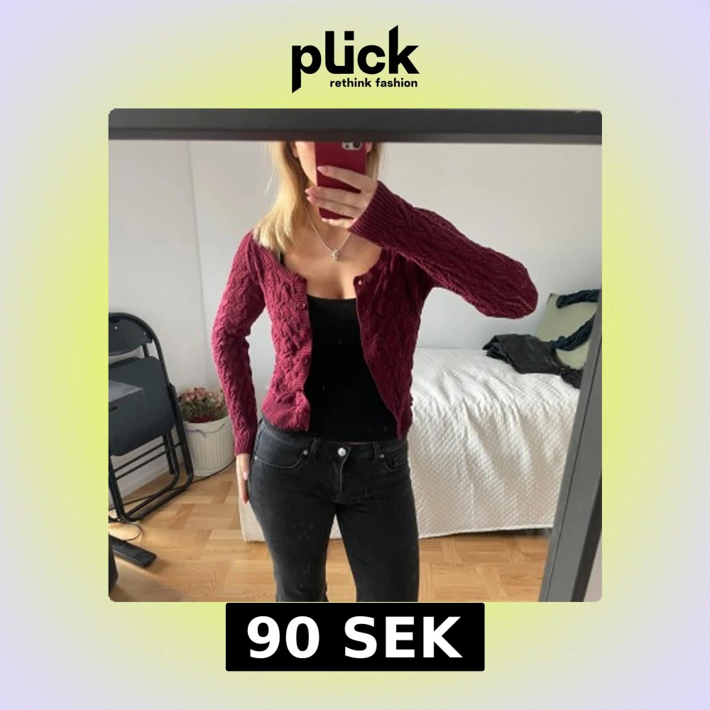 Säljer en vinröd stickad kofta med ett vackert mönster och knappar framtill. Den är både stilren och bekväm i stl 36/38💕
