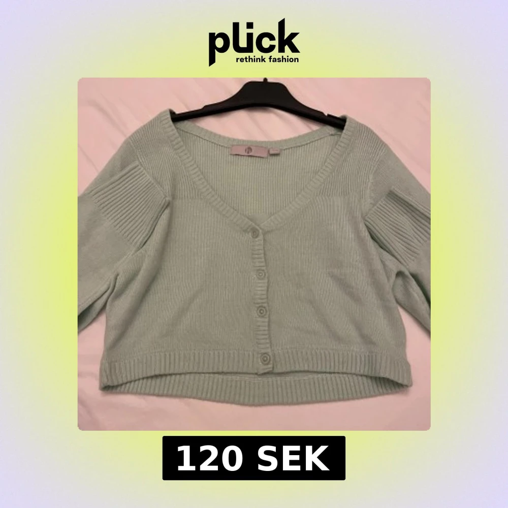Säljer en söt mintgrön stickad kofta med knappar framtill. Den har en v-ringad design och är croppad, vilket ger en modern look. Perfekt för lager-på-lager-stil under svalare dagar.