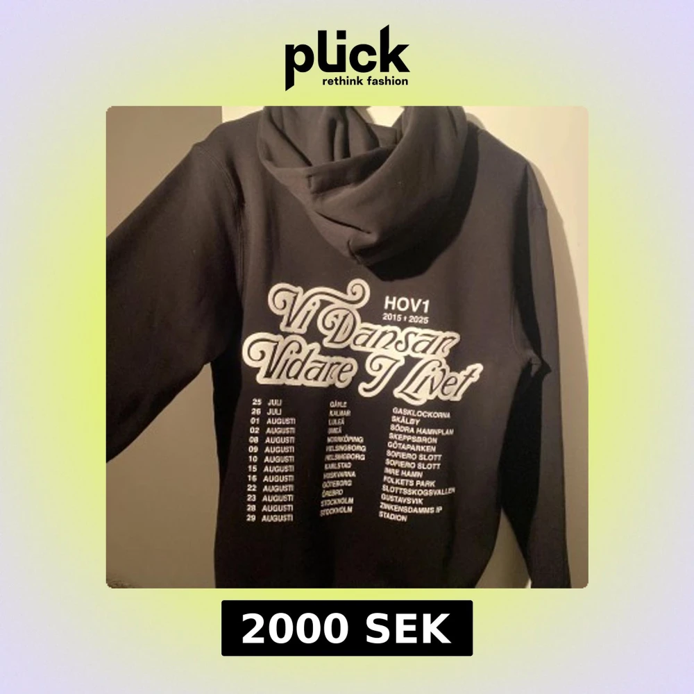 Svart hoodie från Hov1 med stor vit text på ryggen: 'Vi Dansar Vidare I Livet' och turnédatum. I storlek S, priset kan diskuteras