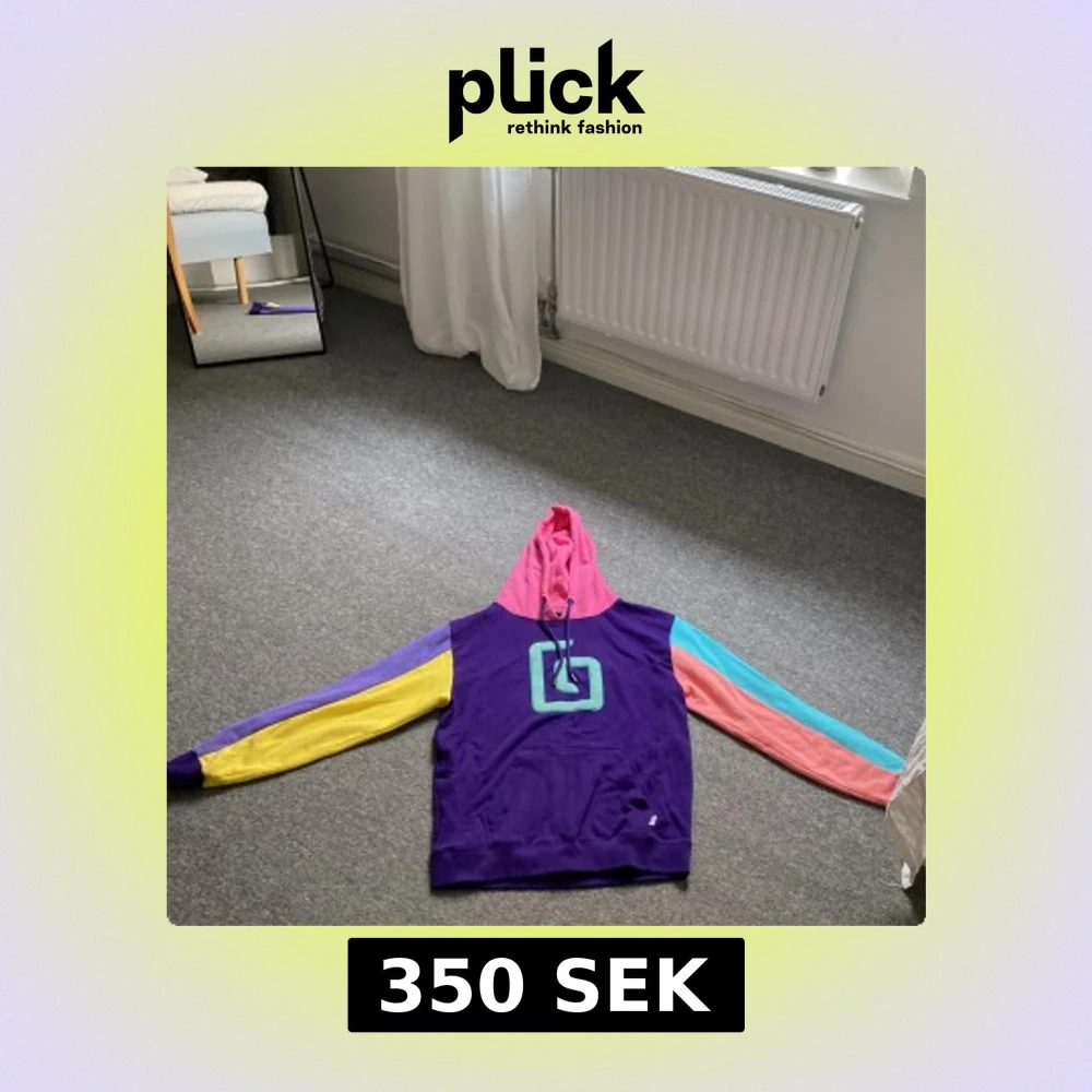 Karl Jacobs merch. Säljer en unik hoodie i lila, rosa, turkos och gul med coolt tryck på bröstet. Tröjan har huva med snörning och långa ärmar i olika färger. Original pris: runt 3000