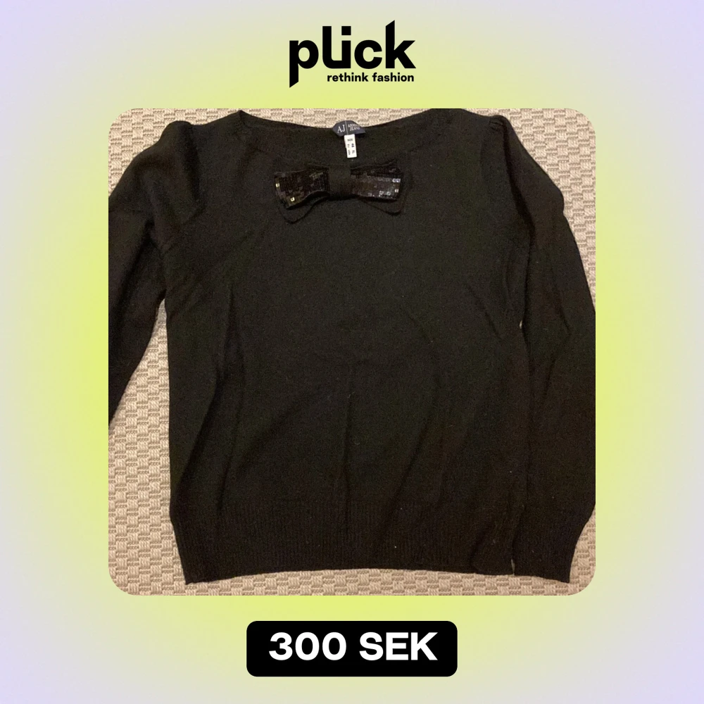 Säljer en elegant svart tröja från Armani Jeans i 100% mjuk finstickad ull. Mjuk och skön. Den har en snygg paljettrosett framtill. Armani ligga vid sidan, diskret men synlig. Perfekt för höst och vinter, kanske julafton med långa ärmar och en lite tightare passform. Passar både till vardags och festliga tillfällen. 🖤✨passar st S el M