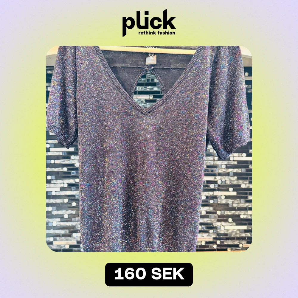 Säljer en superfin glittrig topp från Foster. Den är mörk med ett skimrande glittermönster och har en snygg v-ringning. Toppen har korta ärmar och en söt rosett på baksidan med en öppen ryggdetalj. Perfekt för festliga tillfällen! ✨