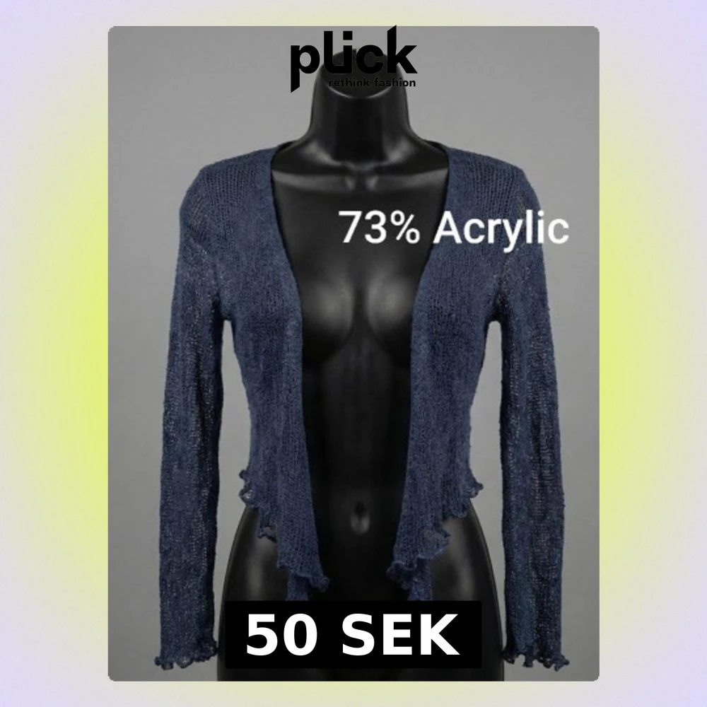 Säljer en tunn, meshig blå kofta från Aganzi. Koftan har vågiga kanter och är gjord i 73% akryl och 27% polyamid. Perfekt för lager på lager och ger en cool, edgy vibe till din outfit.