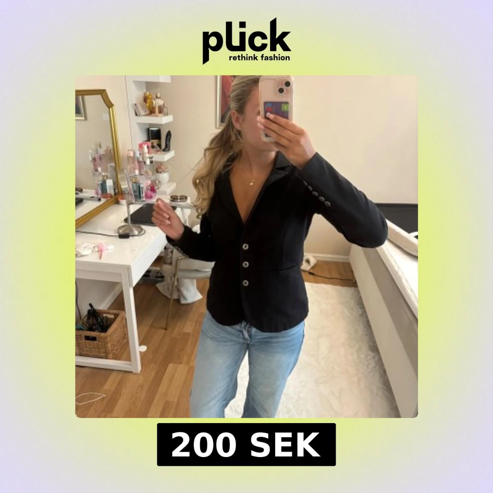 Stilren svart kavaj med tre silverfärgade knappar framtill och klassisk krage. Kavajen har figurnära passform och diskreta fickor på sidorna. Ärmarna pryds av matchande knappar vid mudden. Perfekt för en snygg och enkel look.