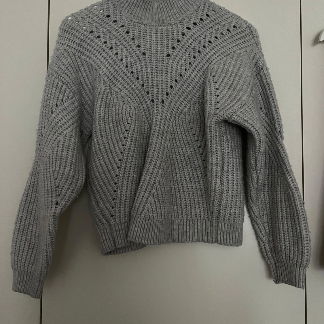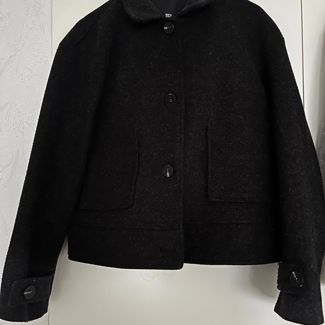 Bild 1: Mysig grå stickad polotröja med snyggt mönster – perfekt både till vardags och att klä upp! Bild 2: Trendig grå kappa i oversize-modell, storlek XS men sitter som S/M enkel att matcha. Bild 3: Svart kappa från Lager, storlek L men är mer åt det tajta hållet – passar bäst S/M. Klassisk modell som aldrig går ur tiden.