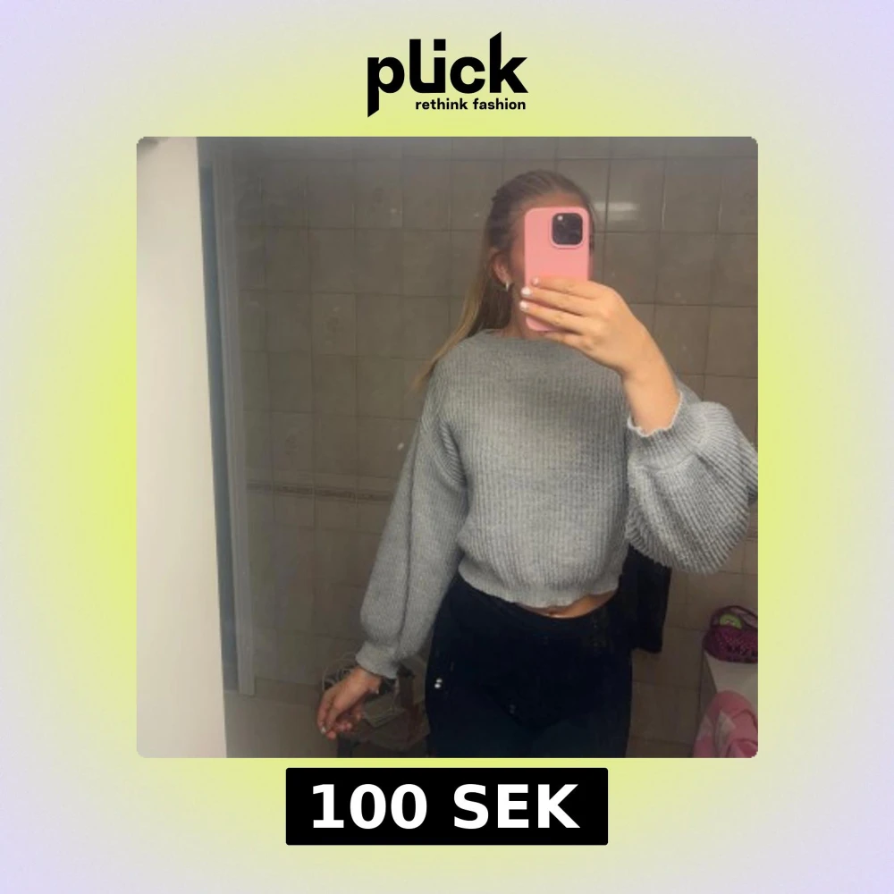 Säljer en grå croppad stickad tröja med ballongärmar och ribbad struktur. Tröjan har en avslappnad passform och är perfekt för kyligare dagar. Använd ett fåtal gånger så i gott skick