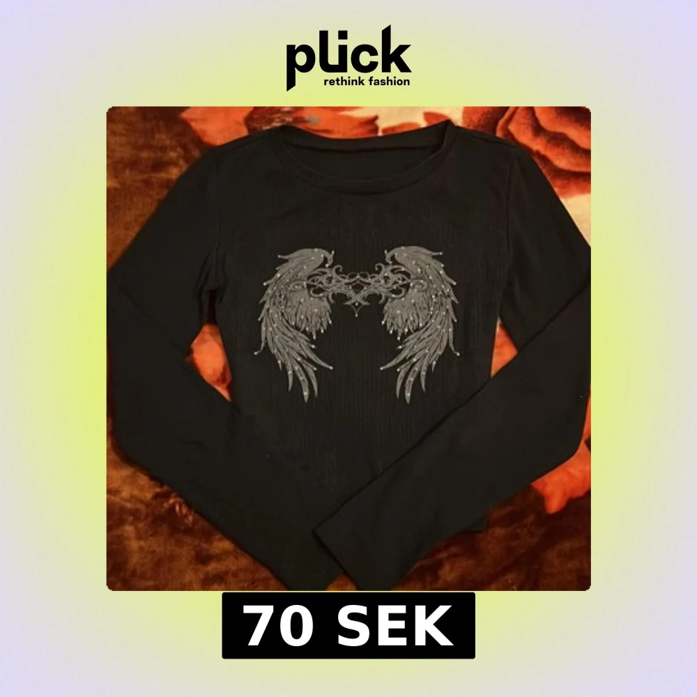 Snygg svart långärmad tröja med ett detaljerat vingmotiv i silver på framsidan. Perfekt för en unik stil. Tröjan har en normal passform och är gjord i ett mjukt material. Storleken på tröjan är S!🤗