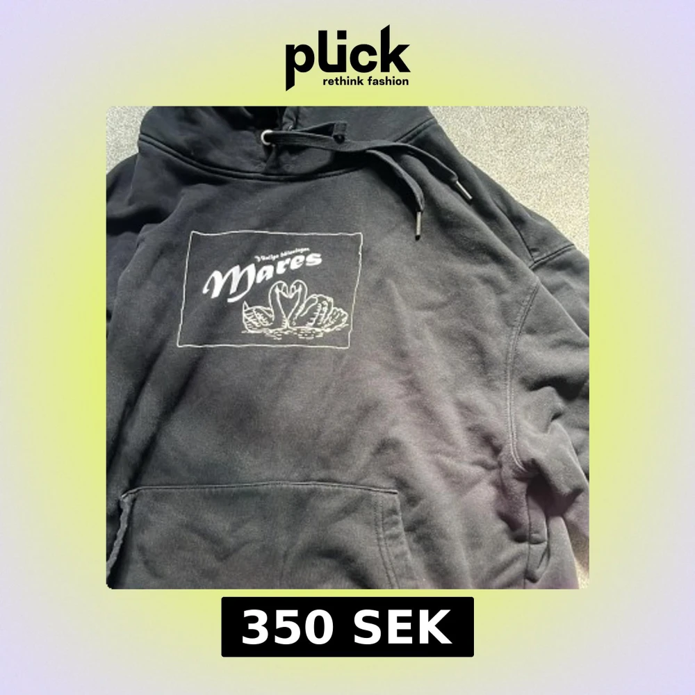 Svart hoodie från Mares med vit tryckt logga och svanmotiv på bröstet samt turnélistan 'Svanesång Tour 2023' på ryggen. Klassisk känguruficka framtill, huva med snörning och mjukt bomullsmaterial.