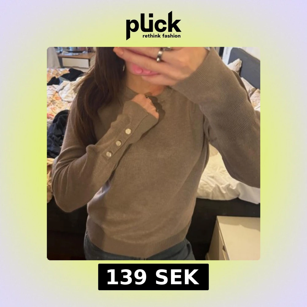 Supersnygg beige stickad tröja med rund hals och långa ärmar. På ärmsluten sitter tre glittriga knappar som ger en extra touch. Perfekt till jeans eller kjol och riktigt skön att ha på sig under kyligare dagar.