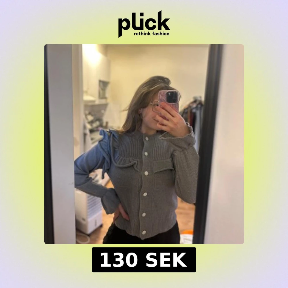 Säljer en grå kofta med volangdetaljer vid axlar och bröst, samt vita knappar framtill. Koftan har lång ärm och ribbade muddar. Perfekt för dig som vill ha något unikt och stilrent i garderoben.