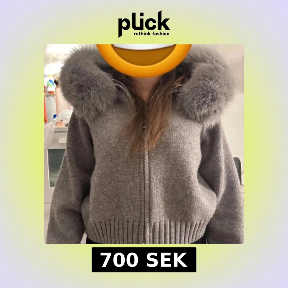 Säljer en mysig grå stickad jacka med en stor, fluffig pälshuva. Jackan/koftan har dragkedja framtill och ribbade muddar vid ärmslut och nederkant. Perfekt för kyliga dagar! (Har endast använt den engång) storlek: One size