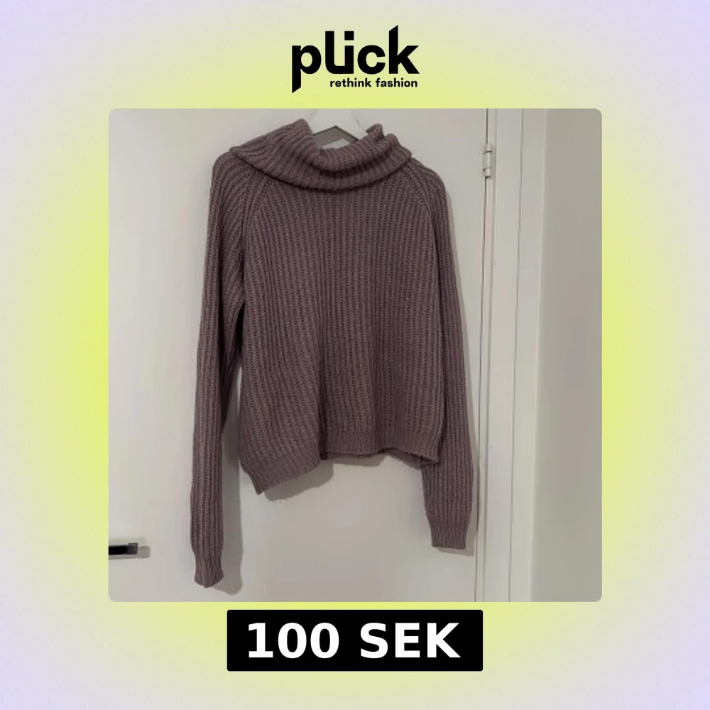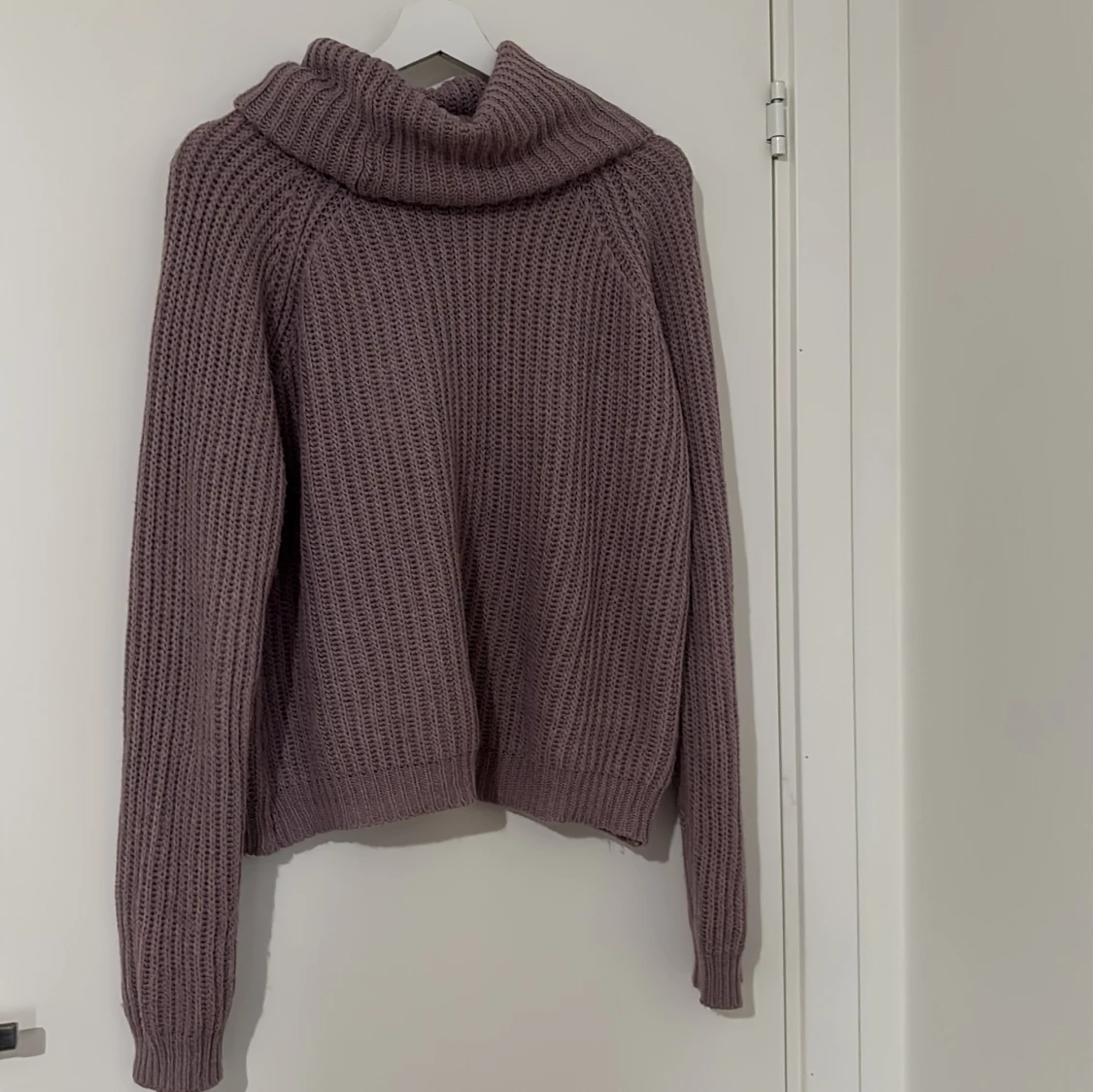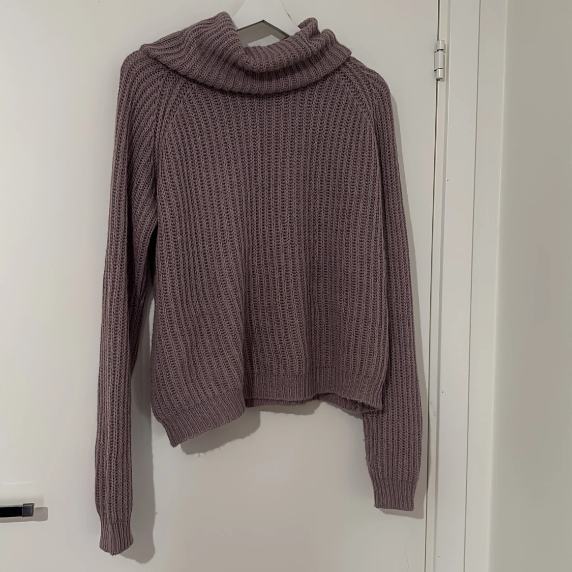 Mysig lila stickad polotröja med grov ribbad struktur och bred krage. Tröjan har långärmade och en loose passform som ger en chill vibe. Perfekt för att hålla sig varm och ändå se snygg ut under höst och vinter.