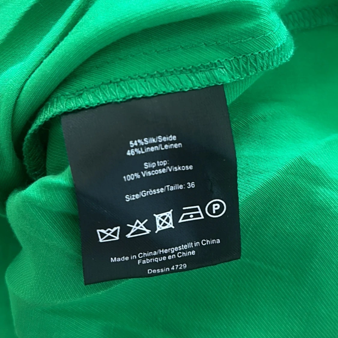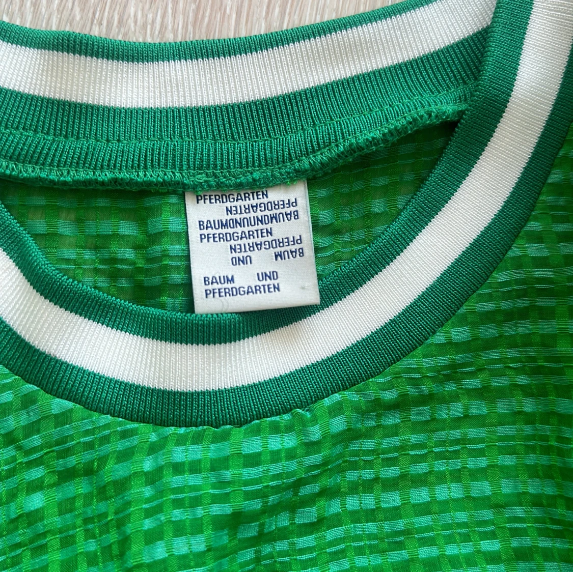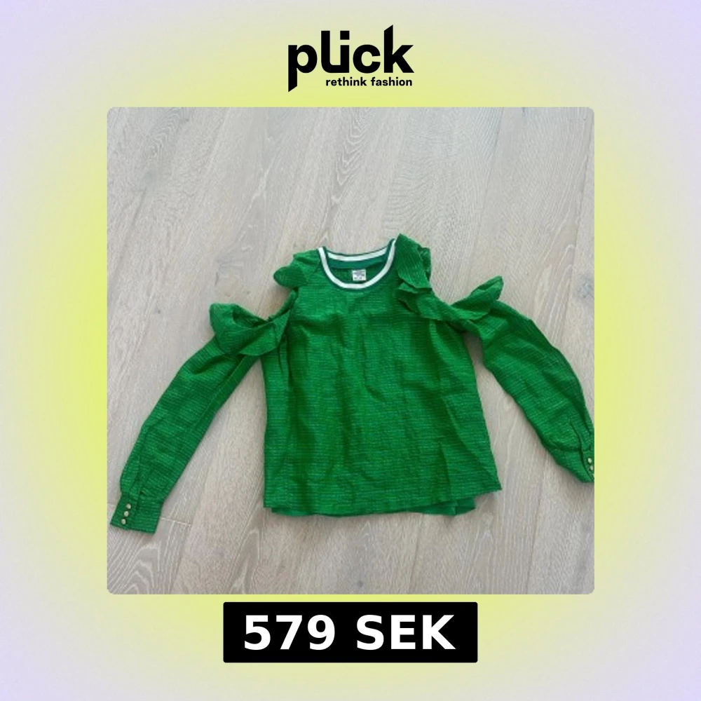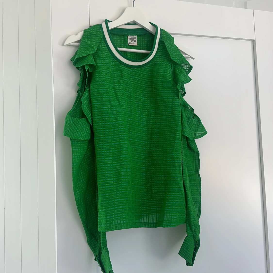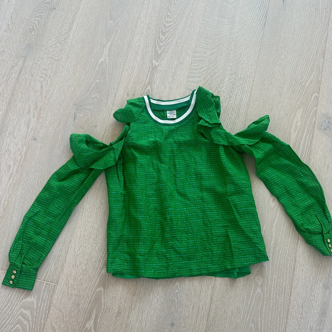 Superfin grön blus från Baum und Pferdgarten med volangdetaljer på axlarna och öppna partier vid ärmarna. Tillverkad i en lyxig mix av siden och linne, med diskret rutigt mönster och knappar vid ärmslut. Perfekt för dig som vill sticka ut med en färgstark och trendig look.