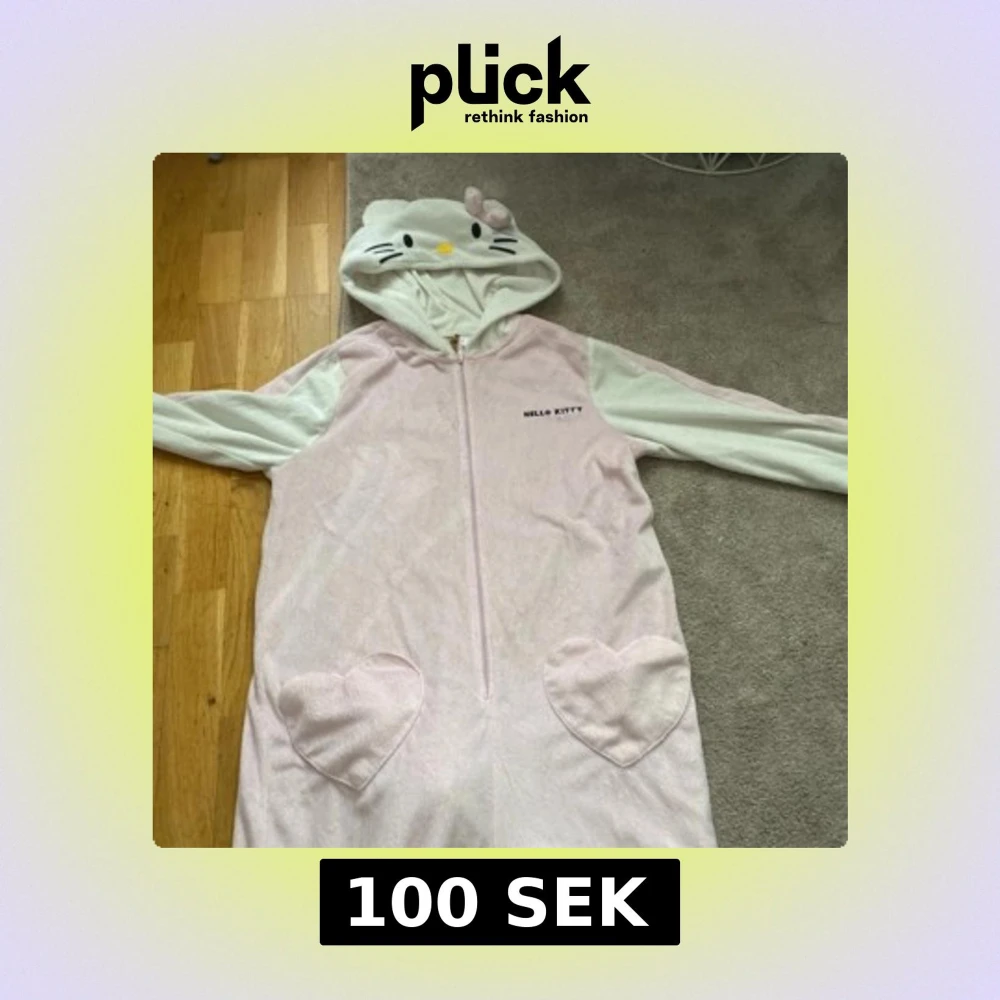 Supergullig ljusrosa och vit Hello Kitty jumpsuit med dragkedja och huva med öron och ansikte. Två stora hjärtformade fickor framtill. Perfekt för dig som älskar söta och mysiga plagg!