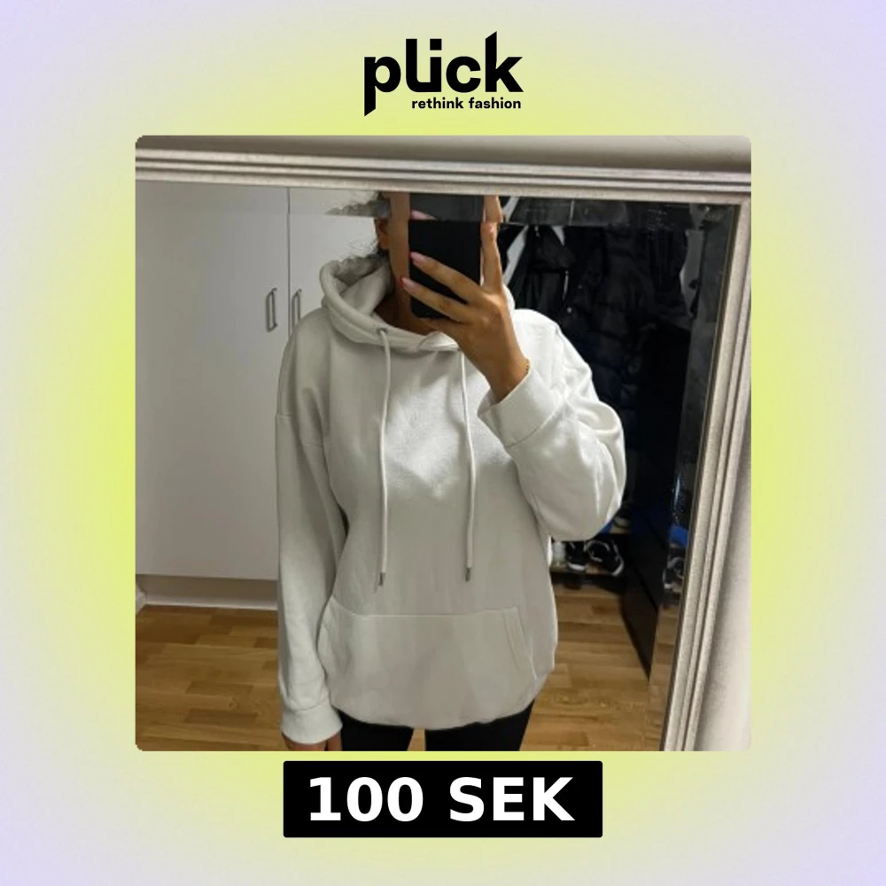 Säljer en vit hoodie med huva och snörning framtill. Tröjan har en stor magficka och är långärmad med ribbade muddar vid ärmslut och nederkant. Perfekt för chill dagar och enkel att matcha med jeans eller leggings.