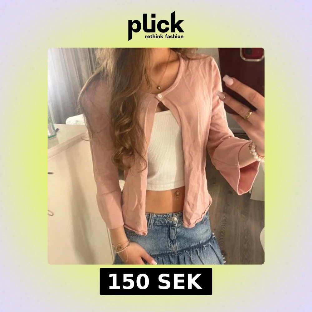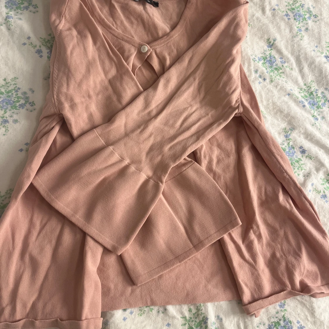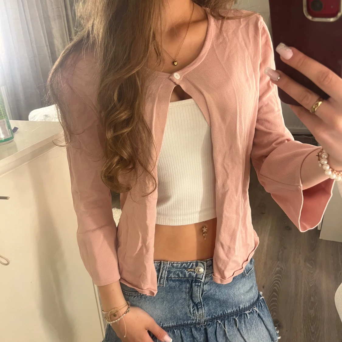 Supersöt ljusrosa kofta från More & More i mjuk bomull. Koftan har långärmade trumpetärmar och en knapp framtill vid halsen. Superfin både stängd och öppen! :)