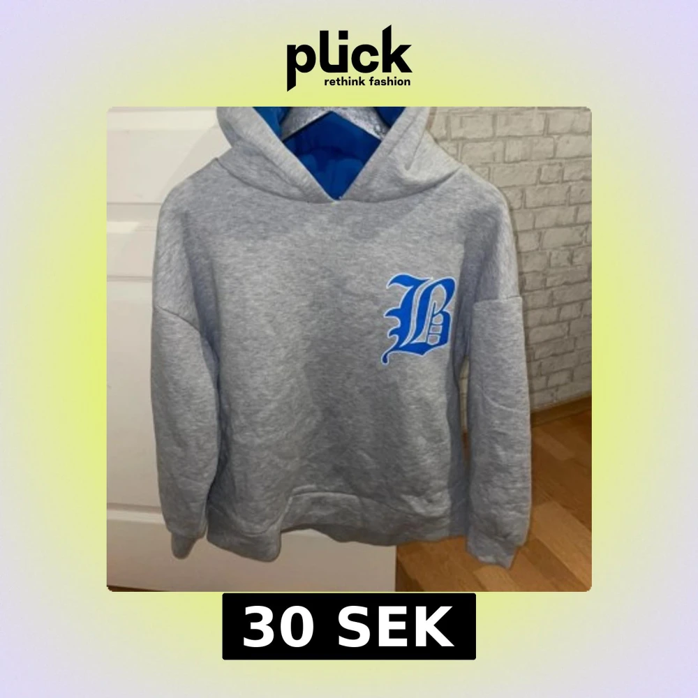 Snygg grå hoodie med stor blå bokstav på bröstet och blått foder i huvan💗