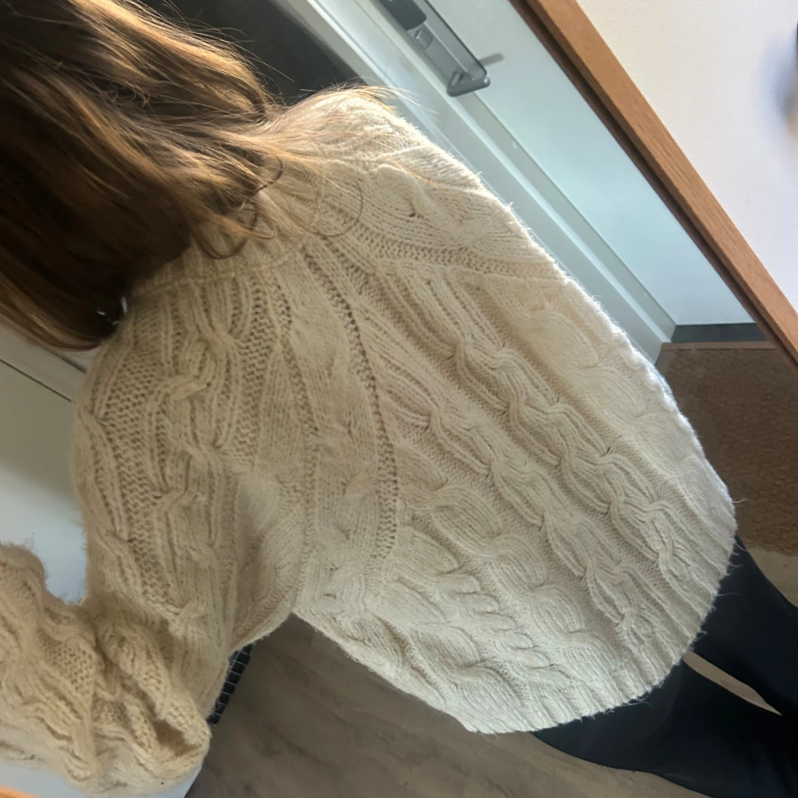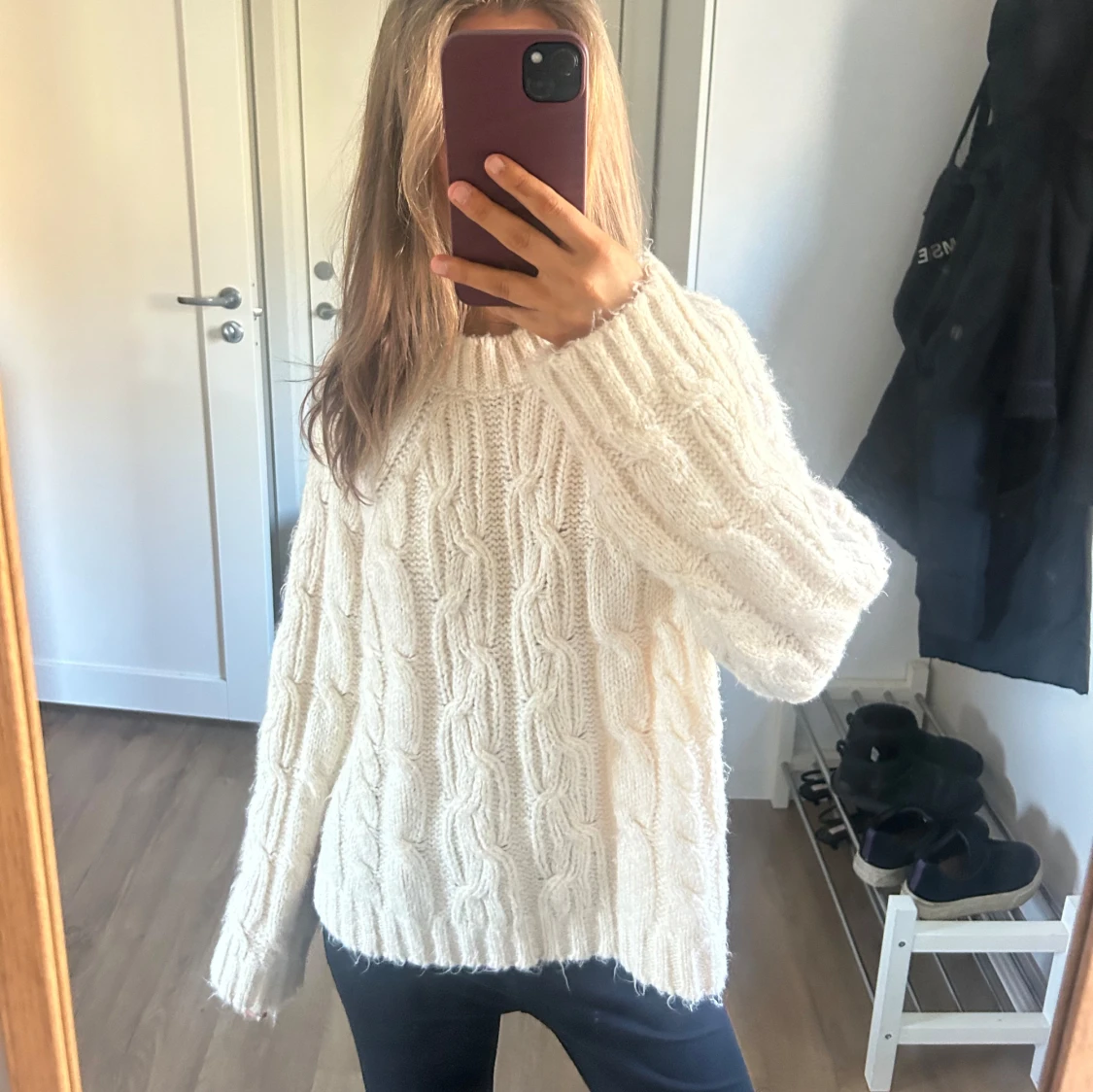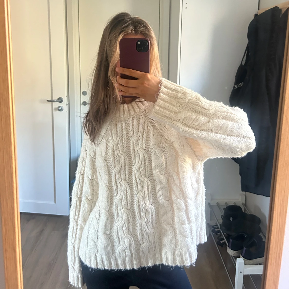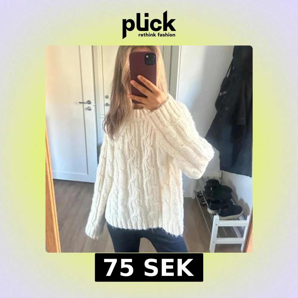 Mysig vit stickad tröja med kabelstickat mönster och lång ärm. Tröjan har en avslappnad passform och rund halsringning.