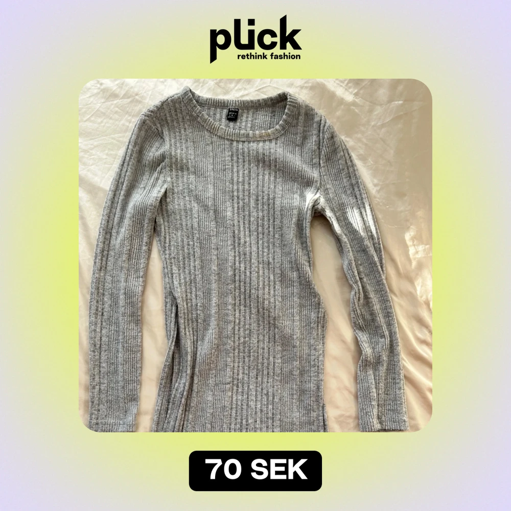 Säljer en stilren grå ribbad tröja med långa ärmar. Perfekt för höst och vinter, den är både bekväm och snygg. Tröjan har en unik design med en slits framtill.