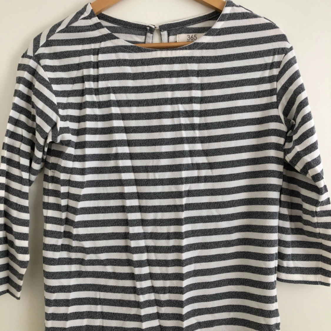 Grå och vitrandig tröja med trekvartsärm och knapp bak i ryggen. Ganska vid modell, större än en vanlig XS i storleken.
