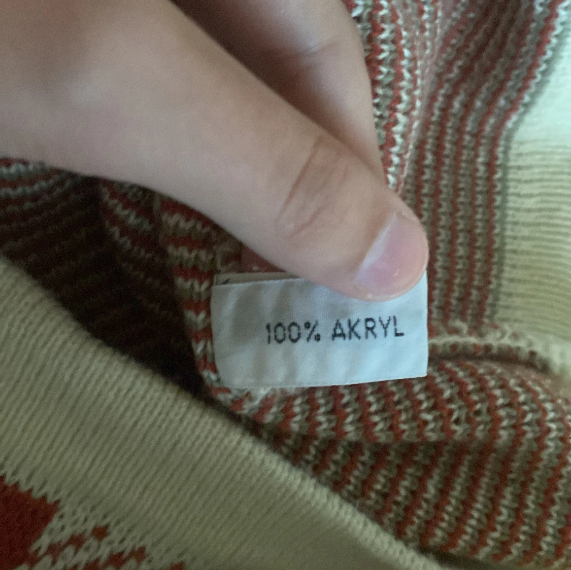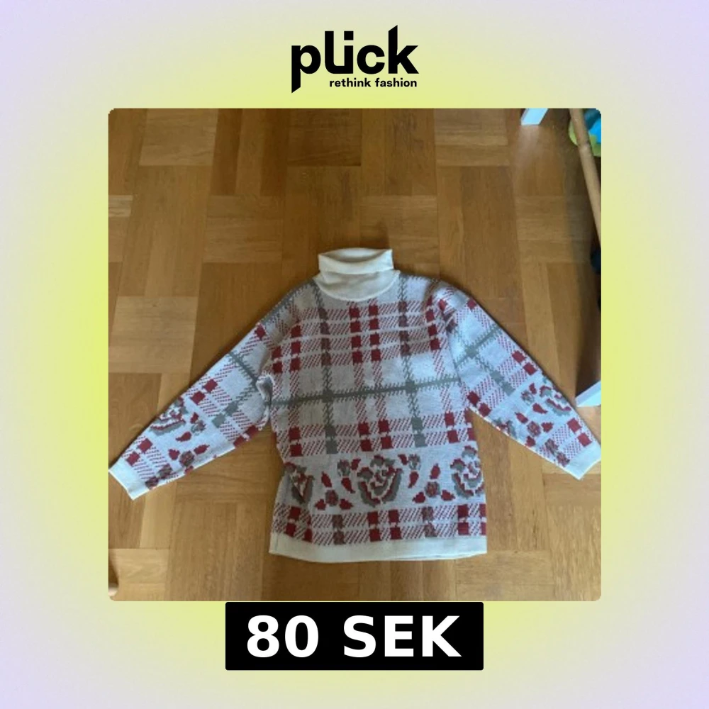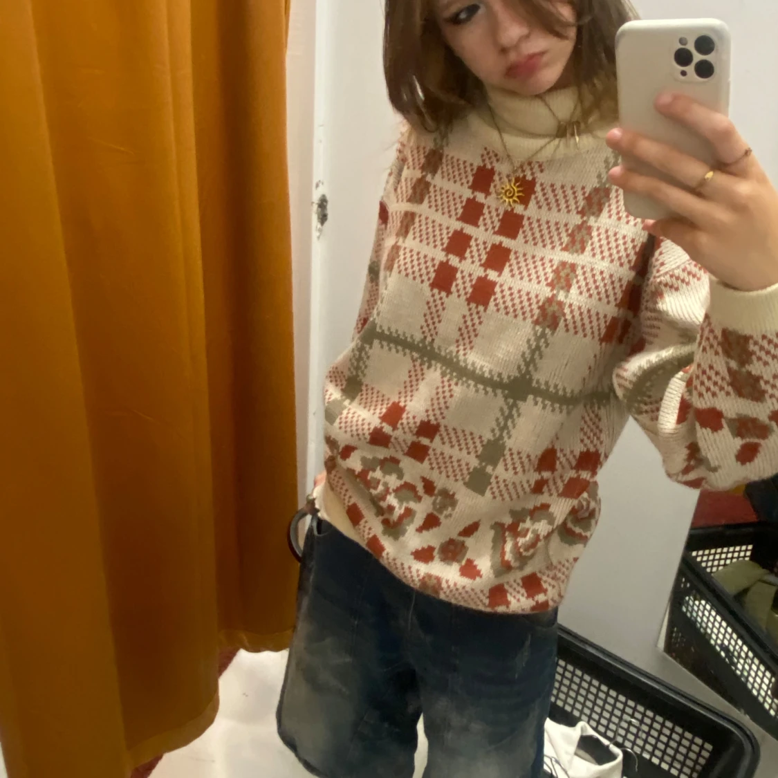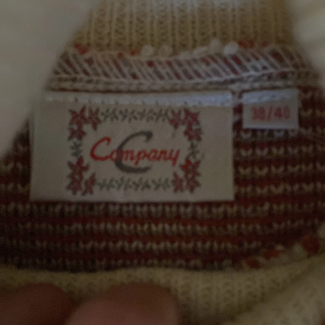 Säljer en beige polotröja från Company med rött och grönt rutmönster samt dekorativa detaljer nertill. Tröjan har lång ärm, hög krage och är gjord i 100% akryl. Perfekt för dig som gillar retrovibbar och vill sticka ut med ett unikt mönster.