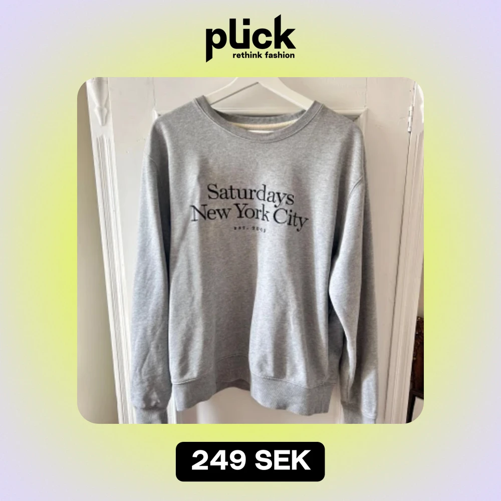 Säljer en stilren grå sweatshirt från Saturdays New York City. Den har en klassisk rund hals och långa ärmar. Perfekt för en avslappnad look, oavsett om du hänger hemma eller är ute på stan. Texten på framsidan ger den en cool touch.