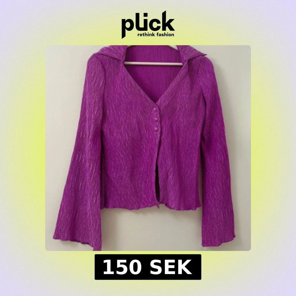 Säljer en lila kofta med plisserat tyg och v-ringning. Tröjan har långa ärmar, knappar framtill och lätt utsvängda ärmslut.