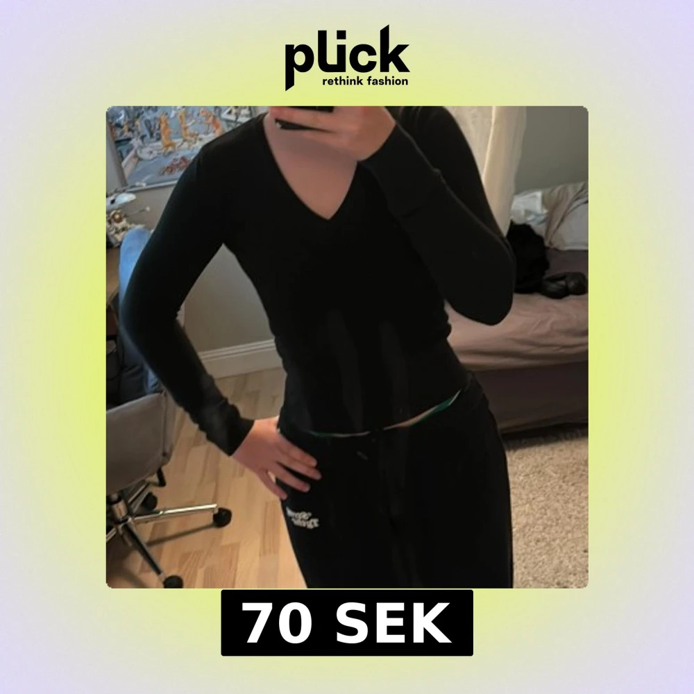 En svart, tight och v-ringad tröja med lång ärm. Tröjan är ribbad nertill och vid ärmsluten, vilket ger en snygg passform. Perfekt att styla med jeans eller kjol för en clean look.
