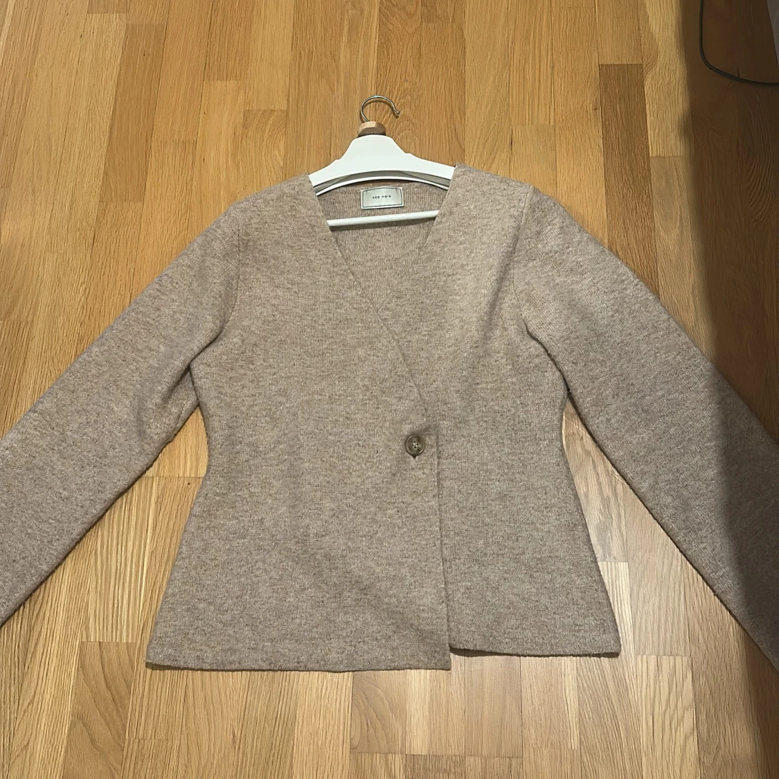 Snygg och felfri stickad kofta med djup hals. Säljer eftersom den inte kommer till användning längre och eftersom jag köpte den för ett högt pris tänkte jag sälja den. Den är i storlek 38 men den skulle absolut fungera för någon i storlek 36 med.
