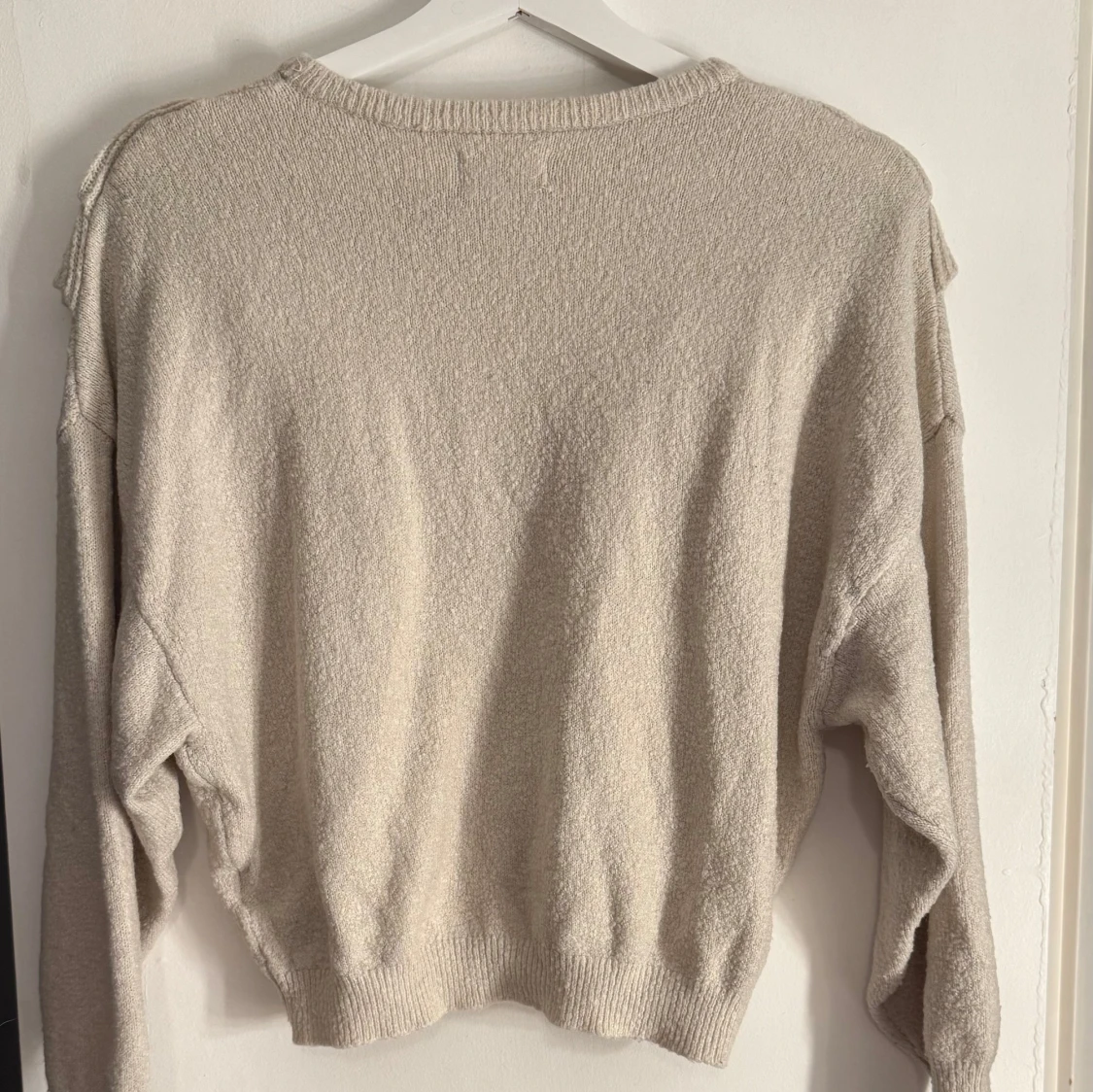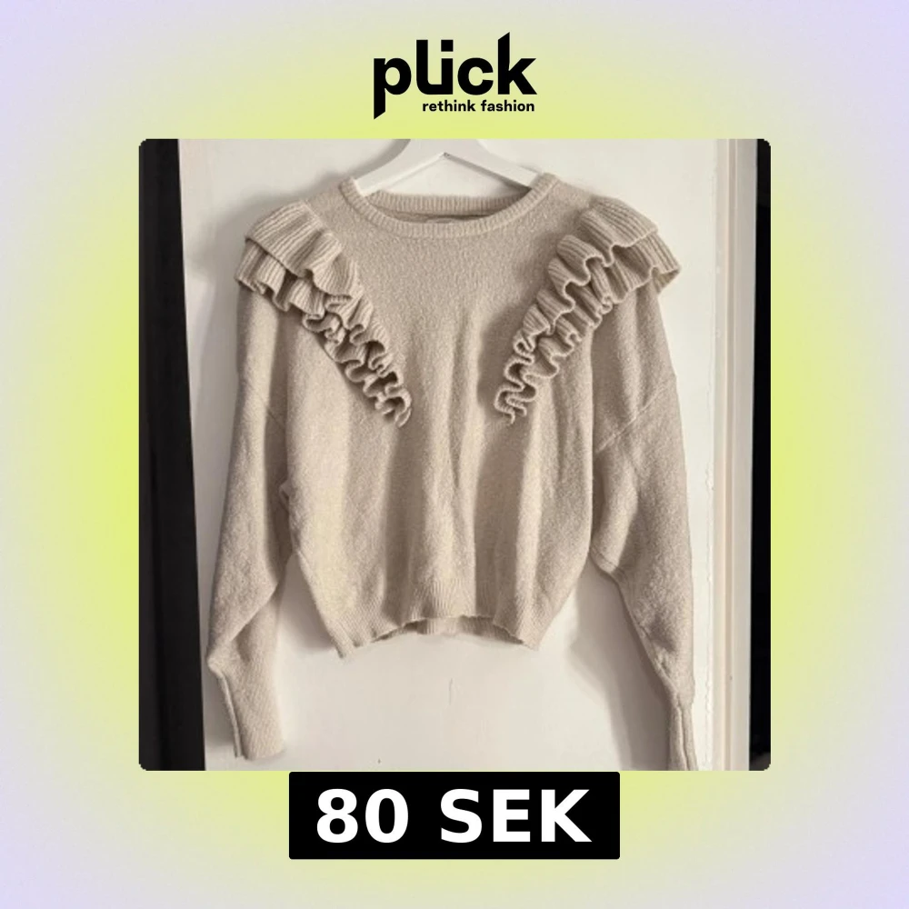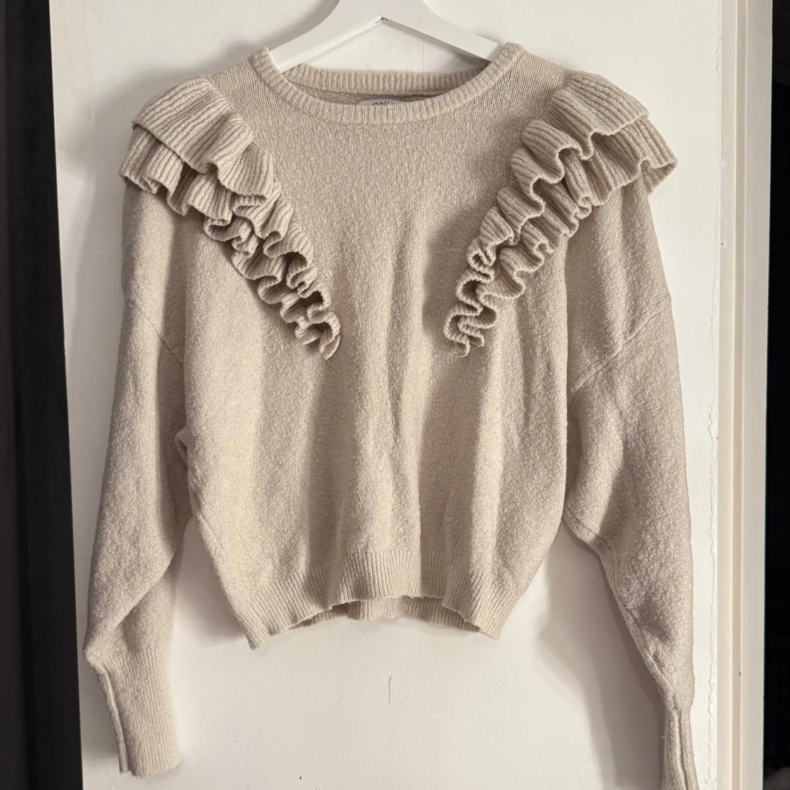 Säljer en mysig beige tröja med volangdetaljer på framsidan. Tröjan har långa ärmar och en rund halsringning. Perfekt för en stilren och bekväm look.