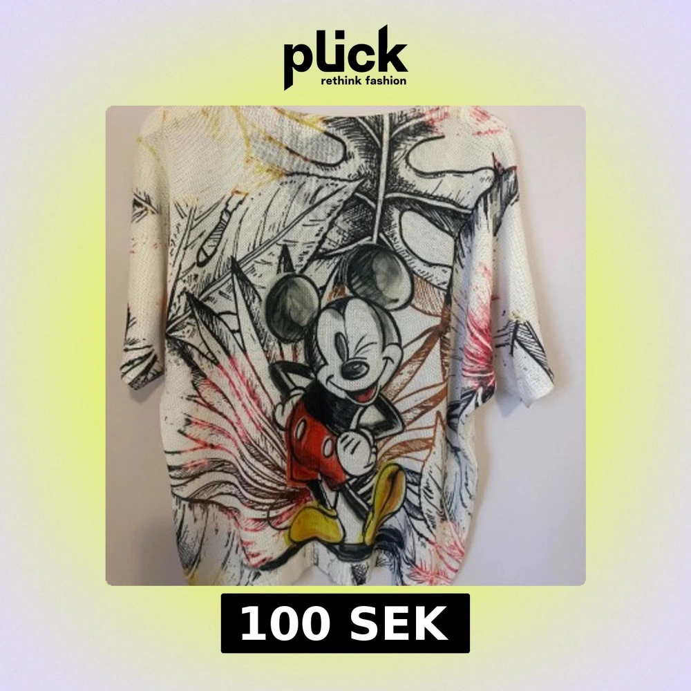 Säljer en cool vit tröja med ett stort Musse Pigg-motiv i svart, rött och gult. Tröjan har korta ärmar och ett färgglatt Musse mönster i bakgrunden. Perfekt för dig som gillar Disney och vill ha en unik stil!