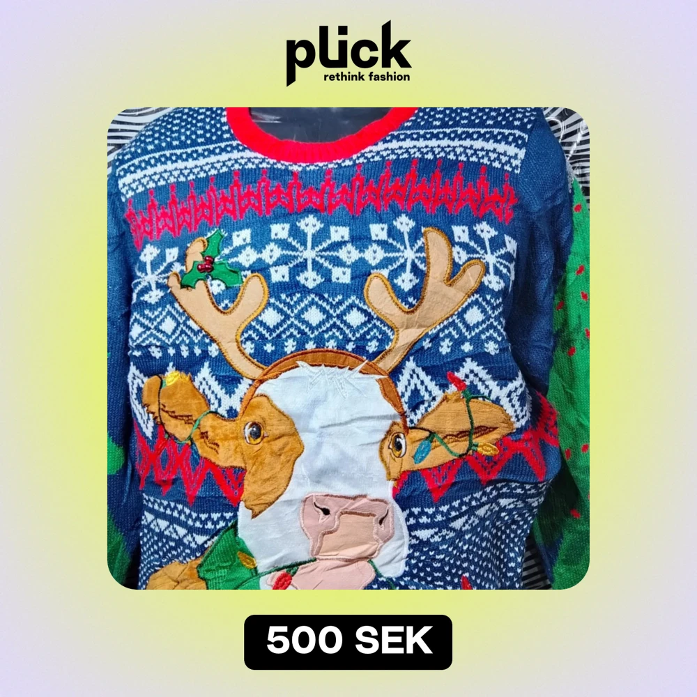 Säljer en supermysig blå jultröja med ett stort renmotiv på framsidan. Tröjan har ett klassiskt vintermönster i vitt och rött, och gröna ärmar med röda detaljer. Perfekt för julfesten eller en mysig dag hemma. Den är långärmad och har en skön passform. 🎄